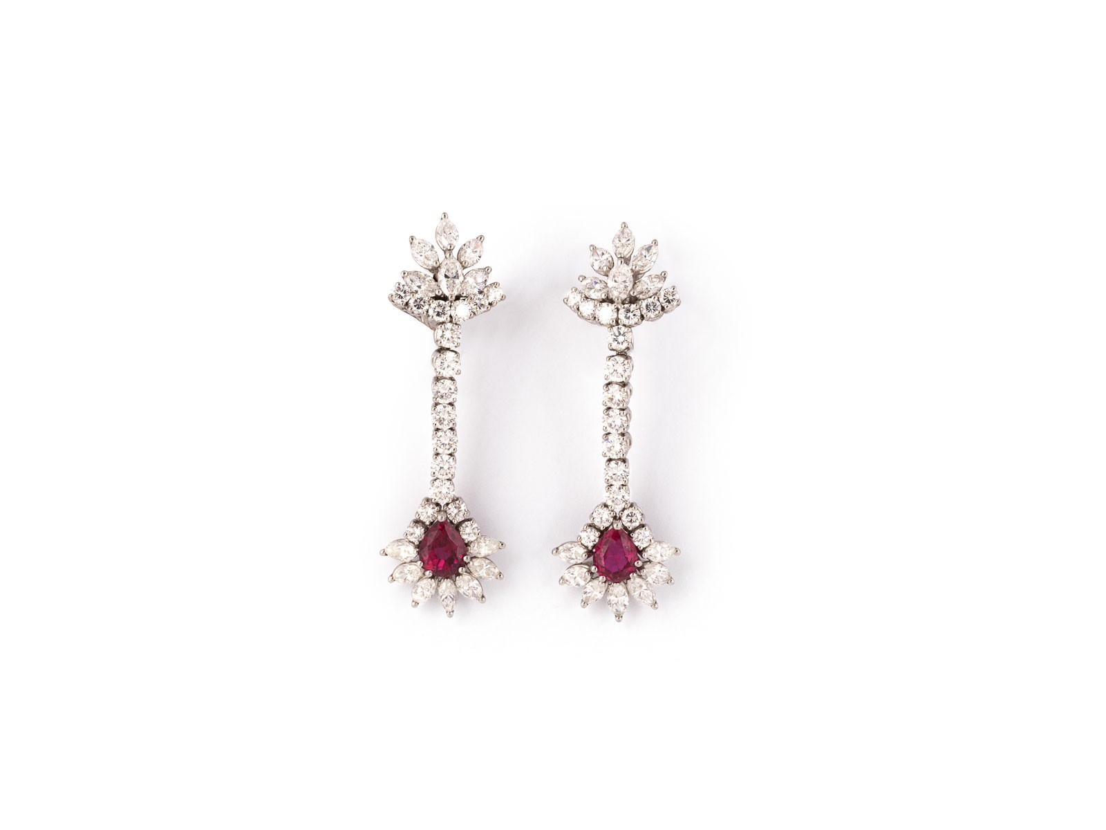 WG 750. Maße: ca. 40,1 mm x 14,1 mm. Ges.-Gew.: ca. 9,3 g. Lange Ohrhänger, besetzt mit jeweils einem Rubin á ca. 0.90 ct., sowie Diamanten im