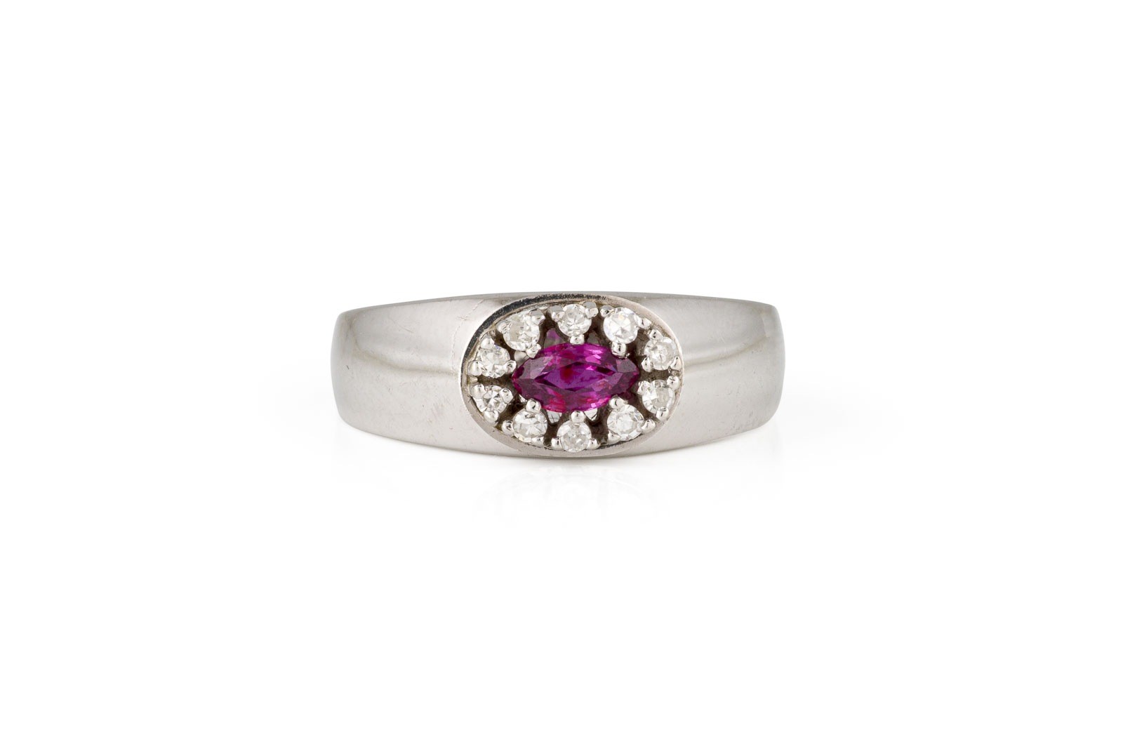 WG 585. Ringmaß: ca. 57,5. Ringbreite: ca 7,4 mm. Ges.-Gew.: ca. 3,9 g. Ring, mit einem zentralen Rubin von ca. 0.20 ct. und einem Kranz aus Diamanten im