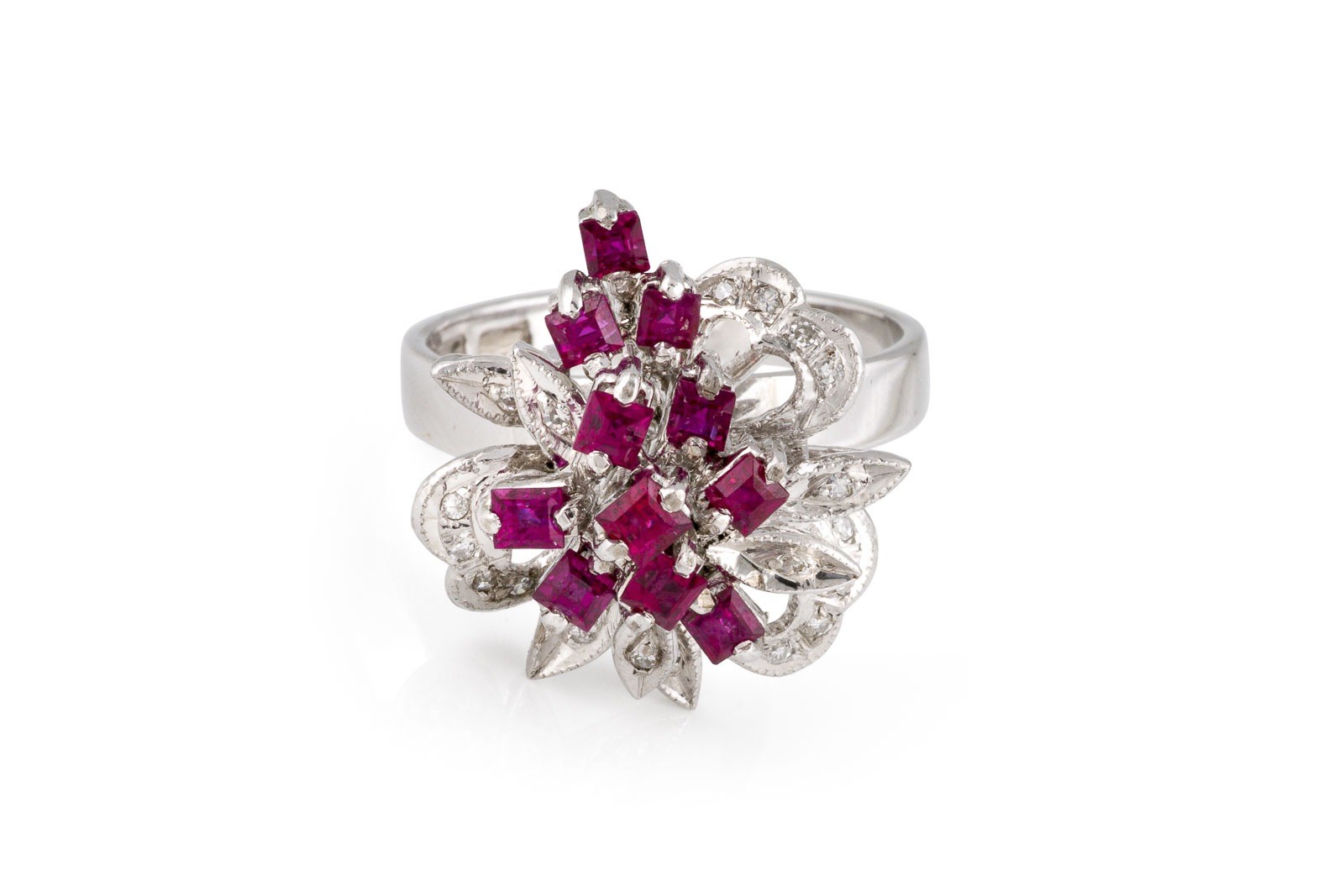 WG 585. Ringmaß: ca. 57. Ringkopfmaße: ca. 20,0 x 18,3 x 1. Ges.-Gew.: ca. 7,0 g. Ring, besetzt mit Diamanten 0.10 ct. und wohl Rubinen zus. ca. 1.00 ct.