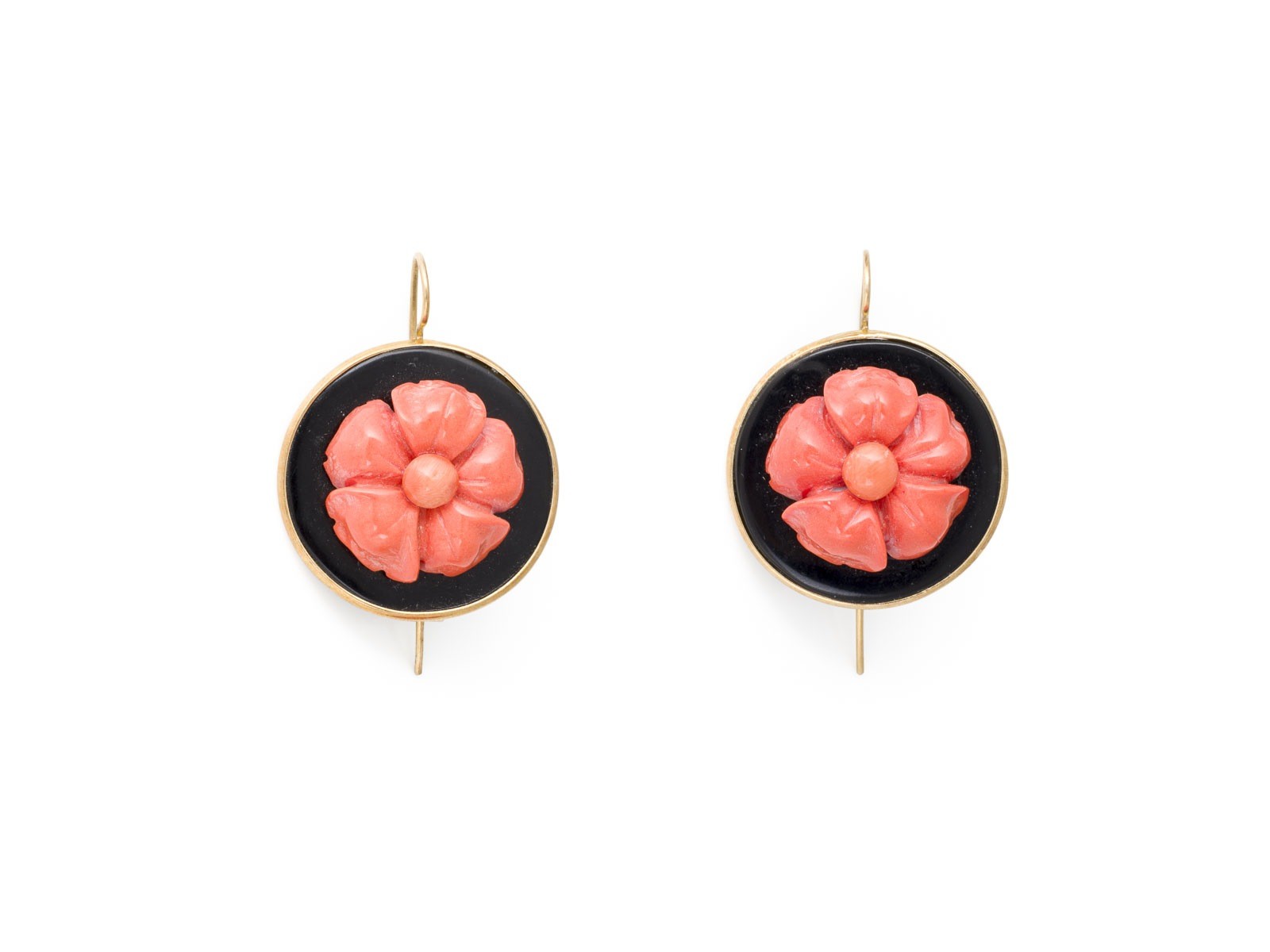 AG 925, vergoldet. Maße: L.: ca. 44,0 mm, B.: ca. 34,5 mm. Ges.-Gew.: ca. 22,5 g. Große Ohrhänger mit Blumen aus Koralle auf einer wohl Onyx Platte.