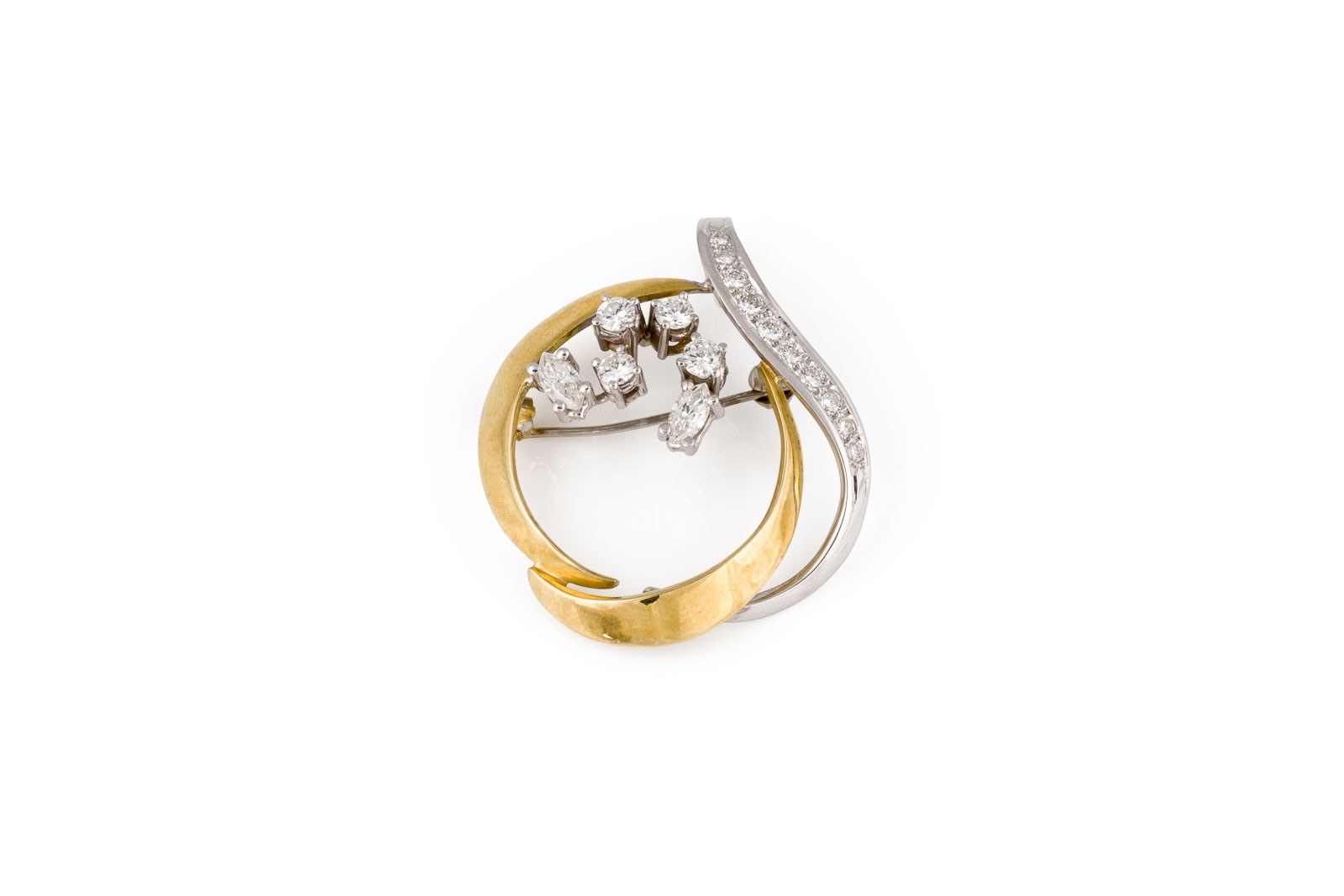WG/GG 750. Maße: ca. 40,0 x 33,0 mm. Ges.-Gew.: ca. 10,0 g. Großer Broschen-Anhänger, besetzt mit Diamanten im Brillant- und Navetteschliff zus. ca.