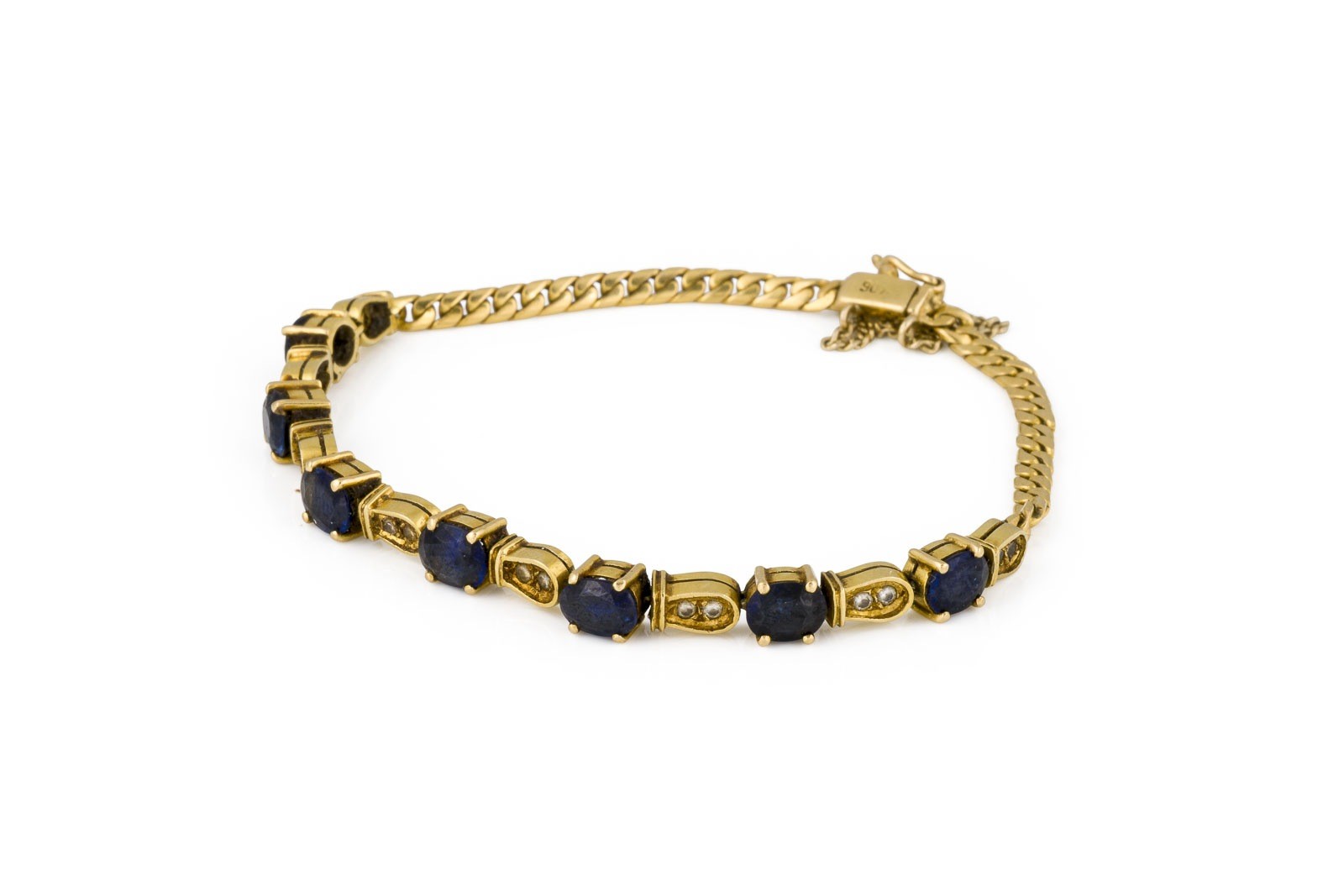GG 750 (getestet). L.: ca. 14,0 cm. B.: ca. 5,0 mm. Ges.-Gew.: ca. 9,8 g. Armband, besetzt mit Saphiren zus. ca. 3.00 ct., sowie Diamanten zus. ca. 0.12 ct.