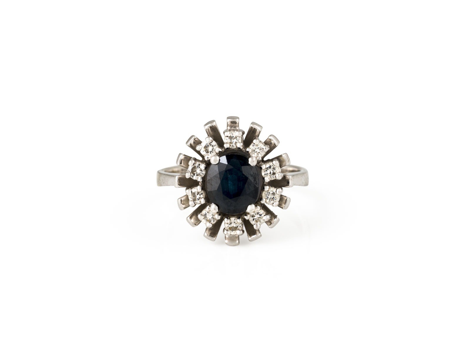 WG 585. Ringmaß: ca. 52. Ringkopfmaße: ca. 16,0 mm x 14,8. Ges.-Gew.: ca. 4,8 g. Ring, besetzt mit einem zentralen Saphir von ca. 1.01 ct., sowie einem Kranz aus Diamanten