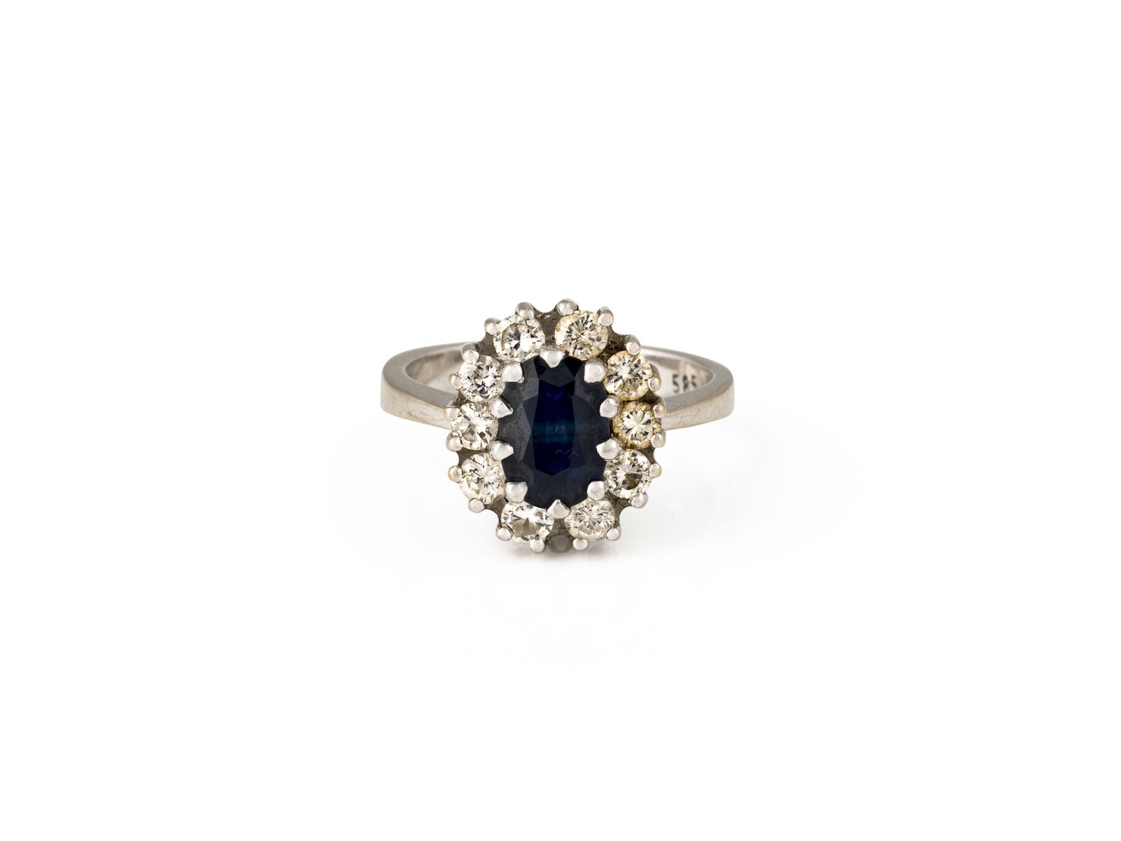 WG 585. Ringmaß: ca. 50,5. Ringkopfmaße: ca. 13,1 mm x 11,. Ges.-Gew.: ca. 4,5 g. Ring, besetzt mit einem zentralen Saphir von ca. 1.00 ct., sowie einem Kranz aus 10