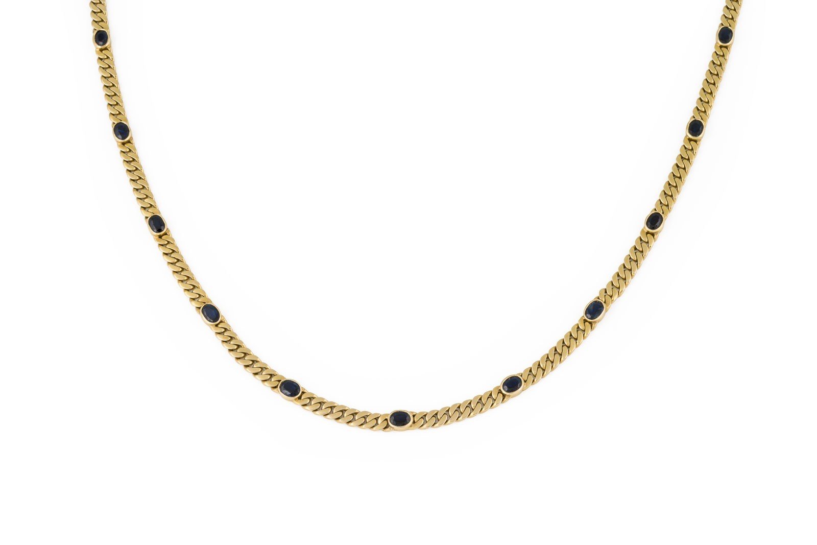 GG 585. Maße: L.: ca. 45,0 cm. B.: ca. 5,0 mm. Ges.-Gew.: ca. 35,9 g. Panzercollier, besetzt mit Saphiren zus. ca. 5.00-6.00 ct. Kastenschloss mit doppelter
