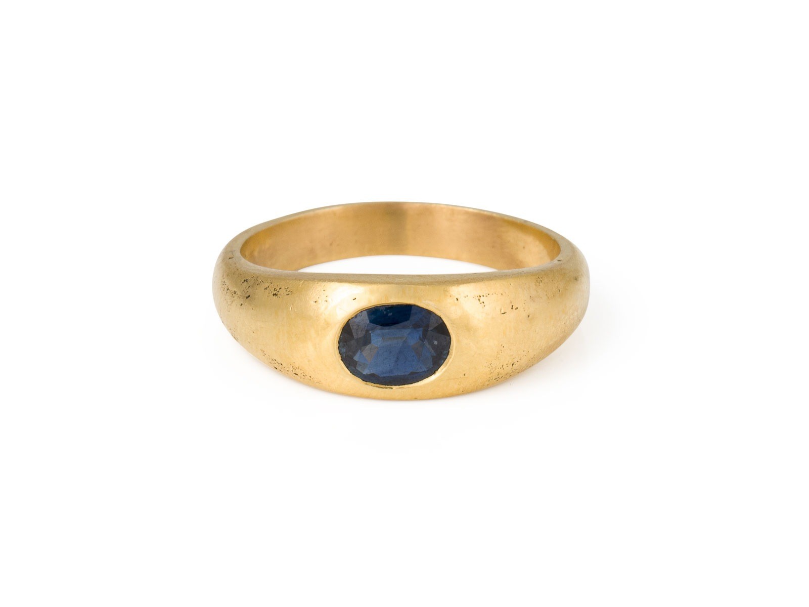 GG 750. Ringmaß: ca. 59. Ringbreite: ca. 7,5 mm. Ges.-Gew.: ca. 9,1 g. Ring, besetzt mit einem zentralen Saphir von ca. 0.70 ct.
