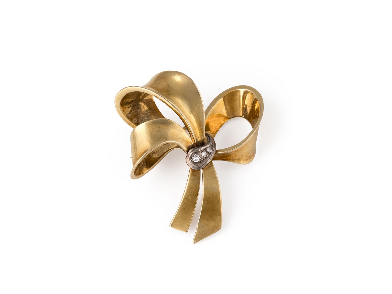 GG 585. Maße: ca. 36,0 mm x 41,6 mm. Ges.-Gew.: ca. 10,3 g. Schleifenbrosche, besetzt mit 3 Diamanten im 8/8-Schliff zus. ca. 0.05 ct.