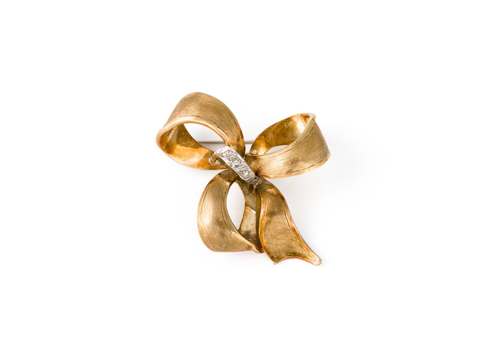 GG/WG 585. Maße: ca. 41,0 x 50,0 mm. Ges.-Gew.: ca. 8,5 g. Brosche in schwungvoller Schleifenform mit einem Diamanten im 8/8-Schliff von ca. 0.03 ct.