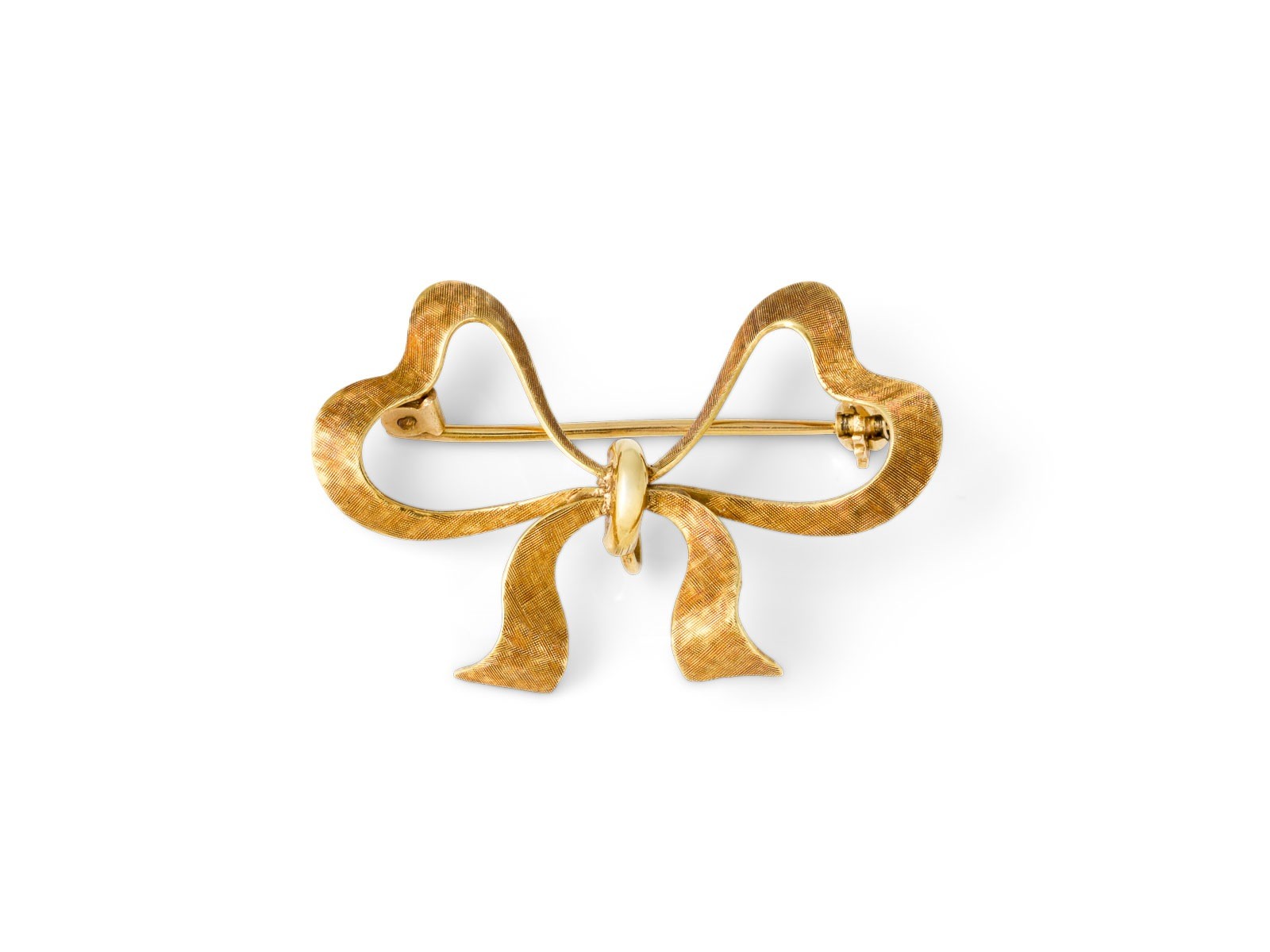 GG/RG 750. Maße: B.: ca. 38,2 mm, L.: ca. 25,6 mm. Ges.-Gew.: ca. 3,5 g. Schleifen Brosche mit Öse, die auch als Anhänger getragen werden kann.