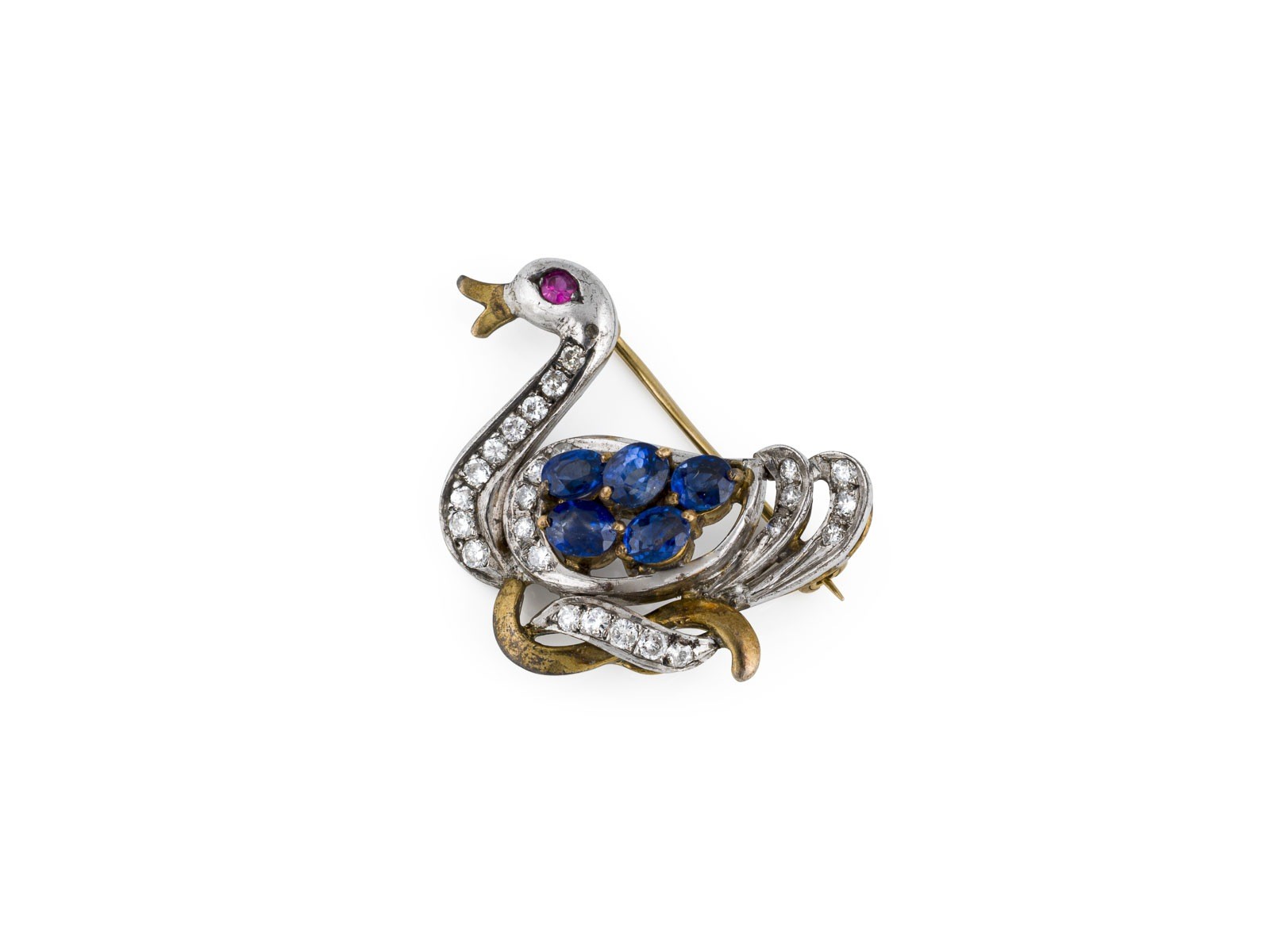WG/GG 585 (getestet). Maße: ca. 25,0 x 24,0 mm. Ges.-Gew.: ca. 4,4 g. Brosche in Form eines Schwans, besetzt mit Diamanten zus. ca. 0.40 ct. sowie blauen und