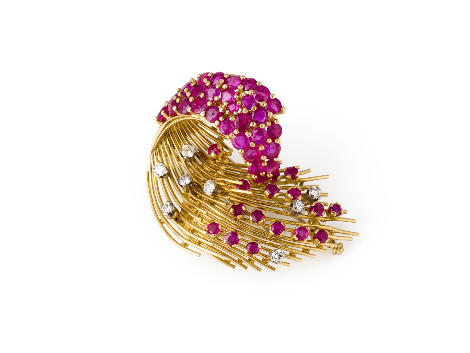 GG 750. Maße: ca. 42,0 mm x 33,2 mm. Ges.-Gew.: ca. 15,0 g. Schwungvolle Brosche, besetzt mit ca. 45 Rubinen zus. ca. 5.00-6.00 ct., sowie 8
