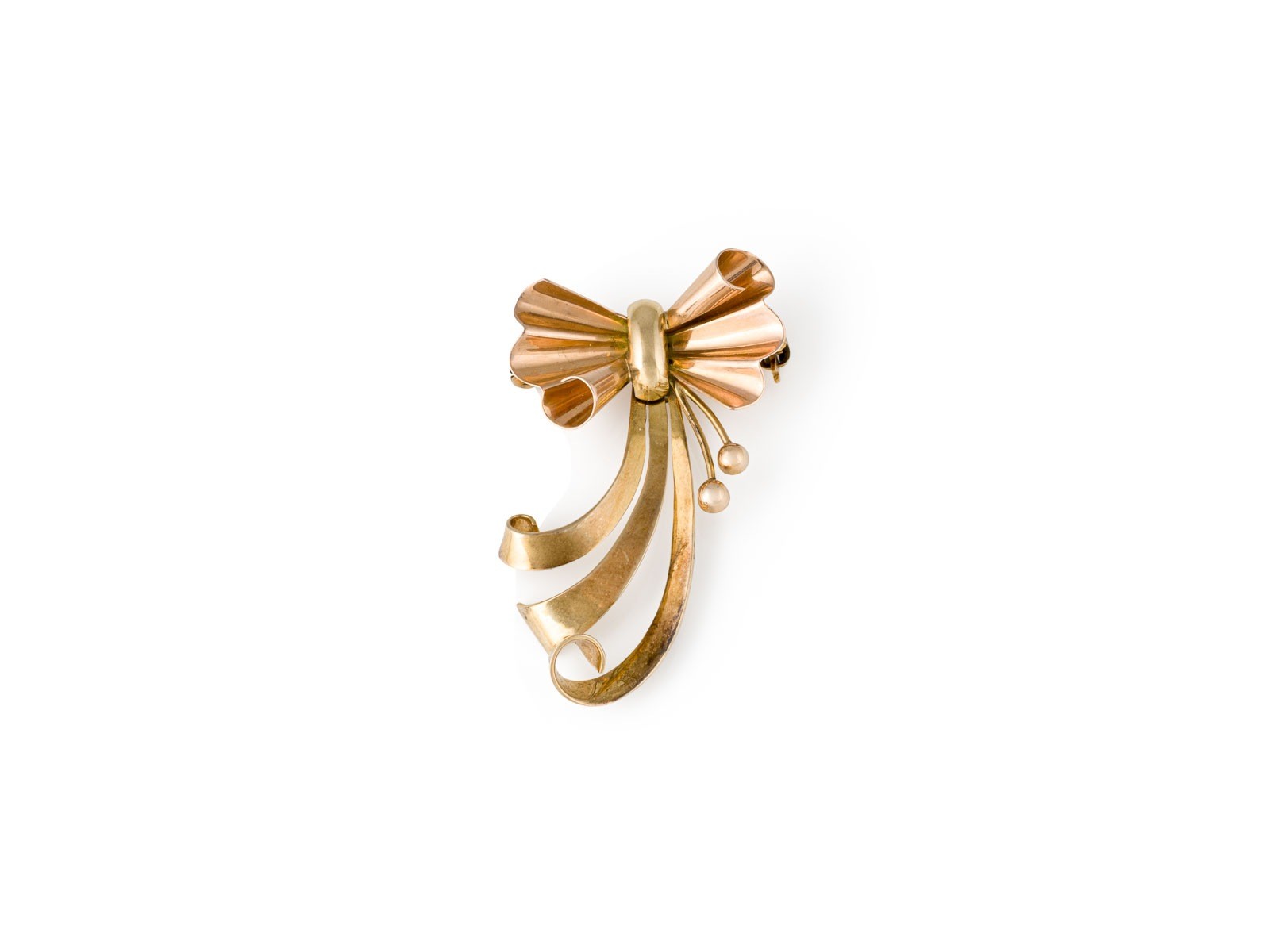 GG/RG 585 (getestet). Maße: ca. 45,0 mm x 28,0 mm. Ges.-Gew.: ca. 6,3 g. Schwungvolle Schleifenbrosche.