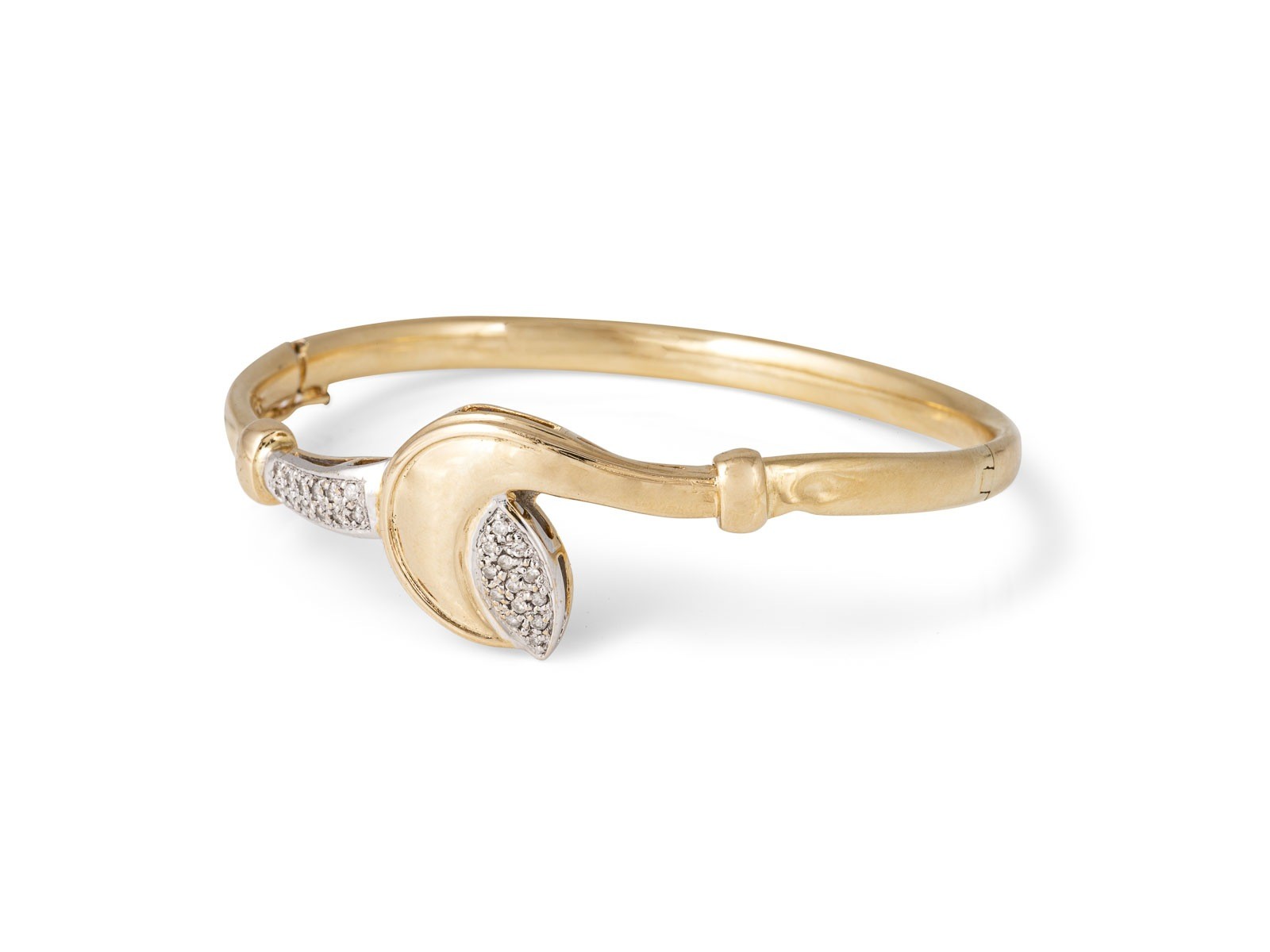 WG/GG 585. Maße: D.(innen): ca. 6,0 cm. Ges.-Gew.: ca. 14,2 g. Schwungvoller Armreif, besetzt mit etwa 25 Diamanten zus. ca. 0.22 ct. Steckverschluss mit