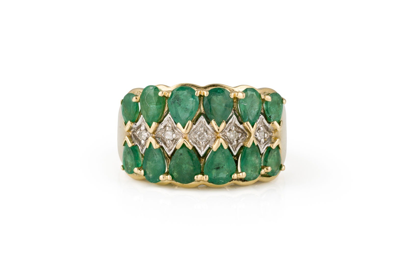 GG 585. Ringmaß: ca. 58. Ringbreite: ca. 12,6 mm. Ges.-Gew.: ca. 6,6 g. Bandring, besetzt mit Smaragden zus. ca. 2.50 ct. und kleinen Diamanten im 8/8-Schliff.