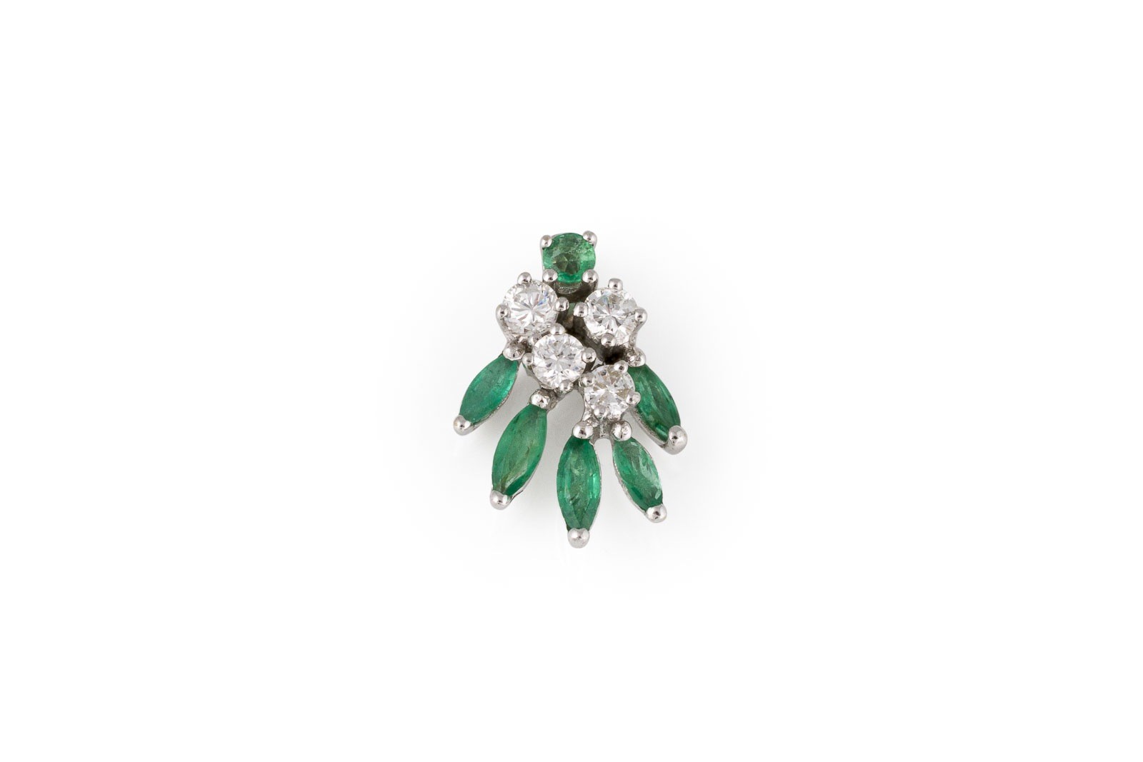 WG 585 (getestet). Maße: ca. 16,4 x 11,4 mm. Ges.-Gew.: ca. 1,6 g. Anhänger, besetzt mit Brillanten zus. ca. 0.30 ct. G-H/VS, sowie Smaragde zus. ca. 0.30