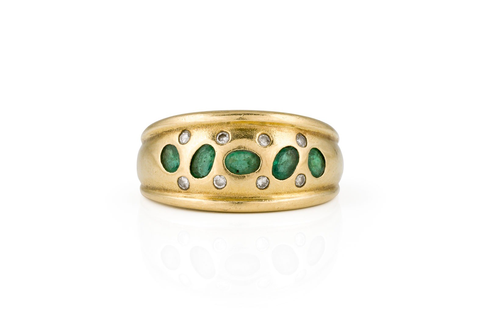 GG 750. Ringmaß: ca. 57. Ringbreite: ca. 10,1 mm. Ges.-Gew.: ca. 5,9 g. Ring, besetzt mit Smaragden zus. ca. 0.30 ct., sowie Brillanten zus. ca. 0.08 ct.
