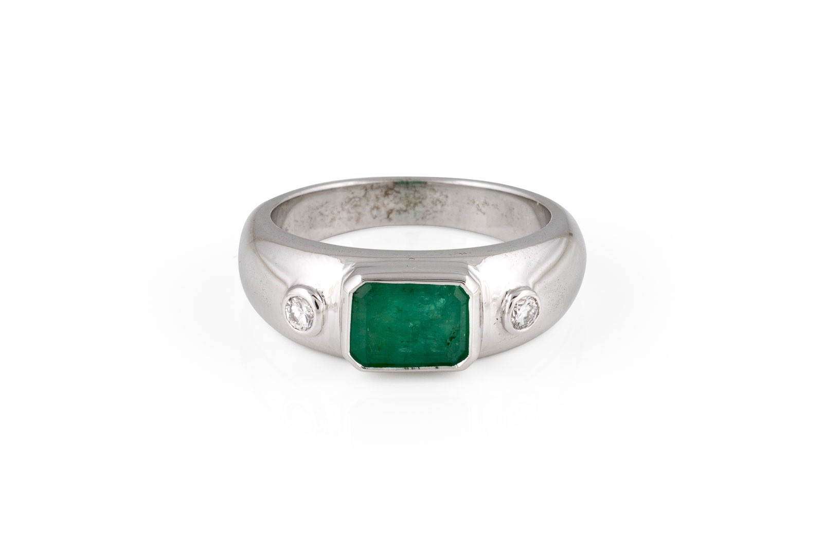 WG 585. Ringmaß: ca. 61. Ringbreite: ca. 8,1 mm. Ges.-Gew.: ca. 11,1 g. Ring, besetzt mit einem zentralen Smaragd von ca. 1.50 ct., sowie seitlich zwei Brillanten
