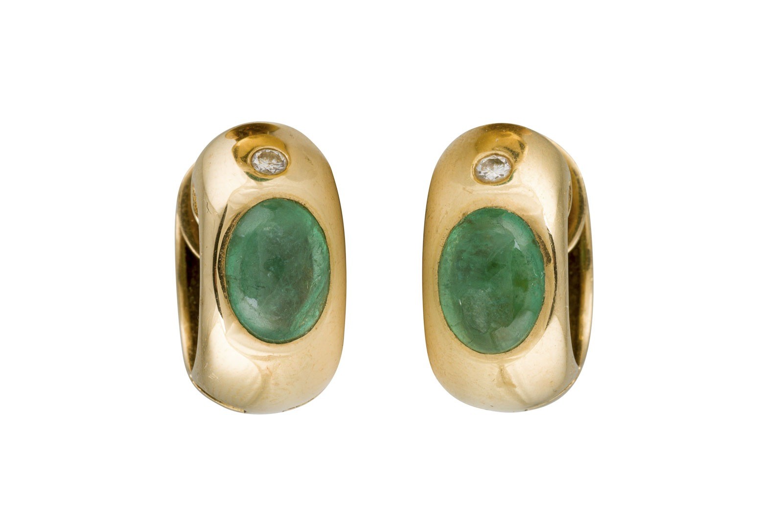 GG 585 (getestet). Maße: D.(außen): ca. 17,0 mm. B.: ca. 8,2 mm. Ges.-Gew.: ca. 9.9 g. Klappcreolen, besetzt mit jeweils einem Smaragd-Cabochon von ca. 1.40 ct., sowie jeweils