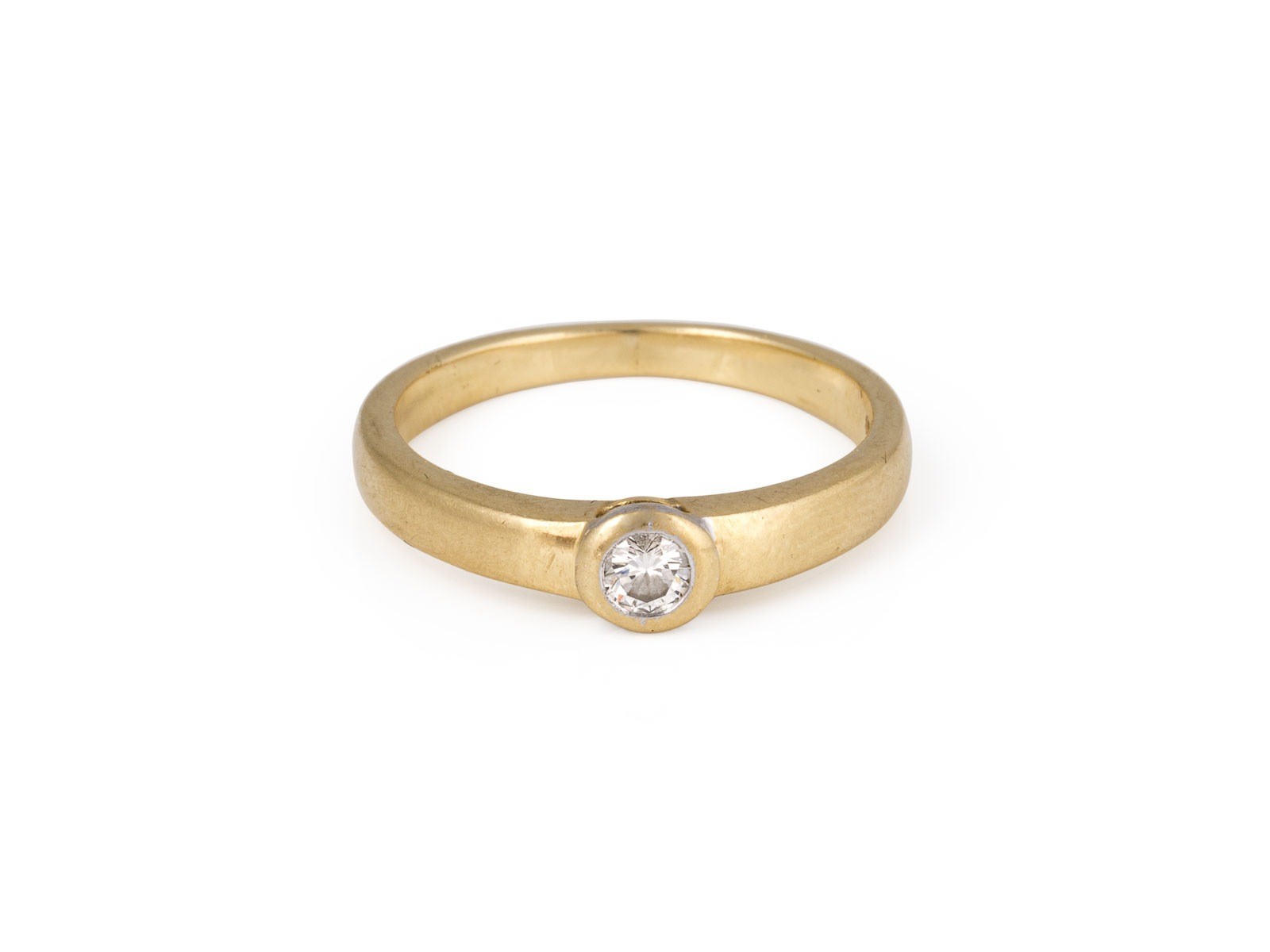 GG 750. Ringmaß: ca. 51,5. Ringbreite: ca. 4,5 mm. Ges.-Gew.: ca. 3,4 g. Ring, besetzt mit einem zentralen Brillanten von ca. 0.10 ct. H/VVS.