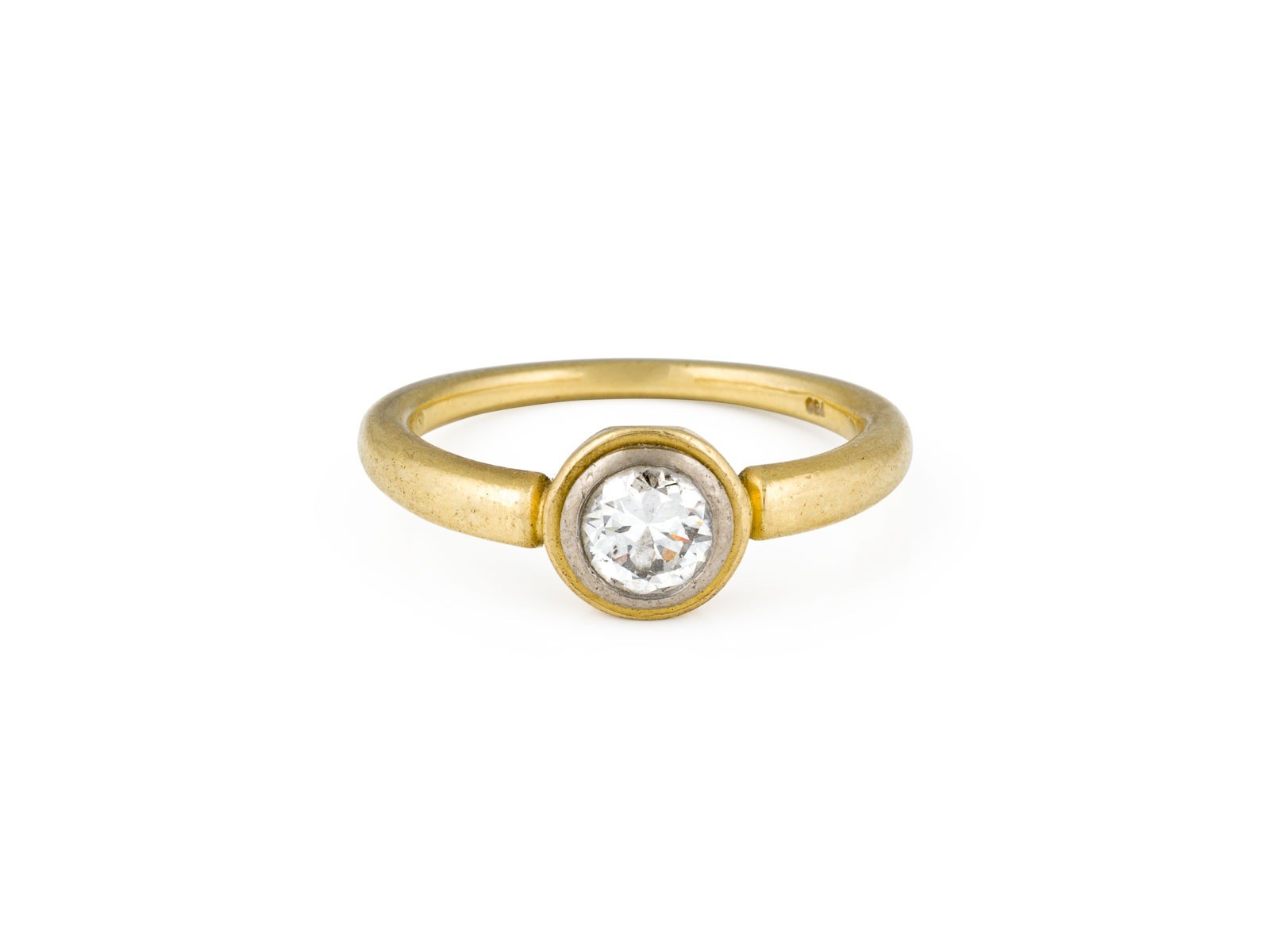 GG 750. Ringmaß: ca. 57. D.(Ringkopf): ca. 8,2 mm. Ges.-Gew.: ca. 6,1 g. Solitärring, besetzt mit einem Brillanten von ca. 0.70 ct. J/SI.