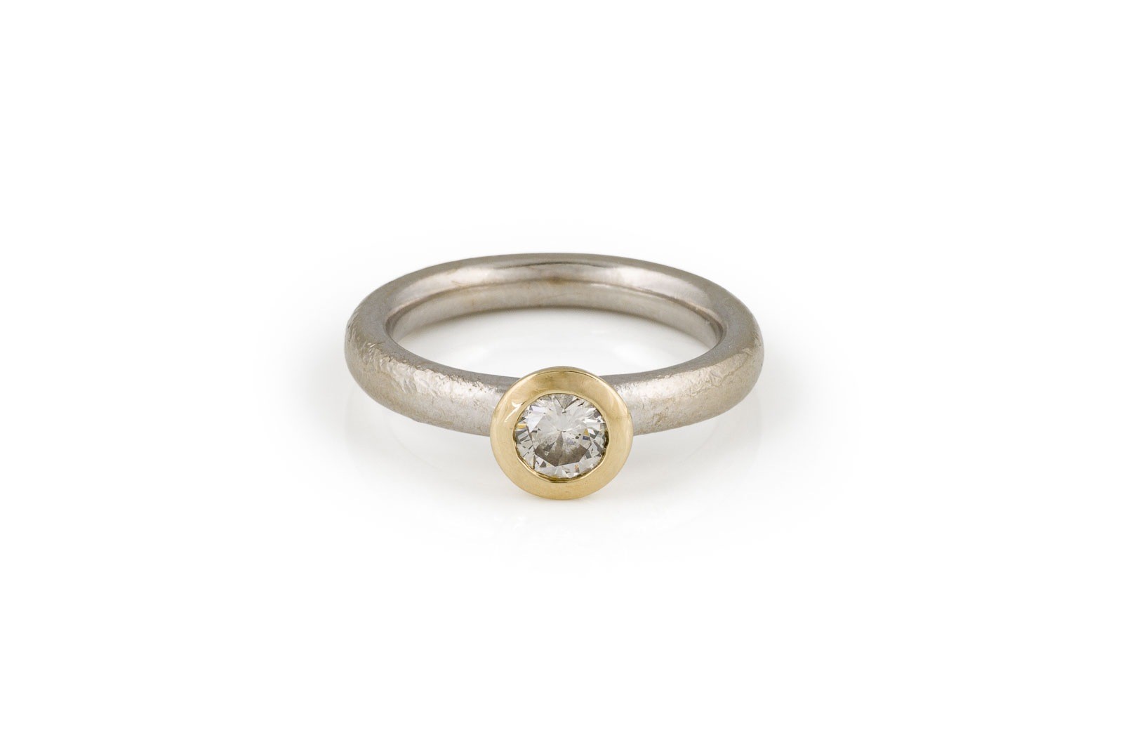 GG/WG 585. Ringmaß: ca. 56. D.(Ringkopf): ca. 7,5 mm. Ges.-Gew.: ca. 7,6 g. Solitärring, besetzt mit einem Brillanten von ca. 0.55 ct. I/P.