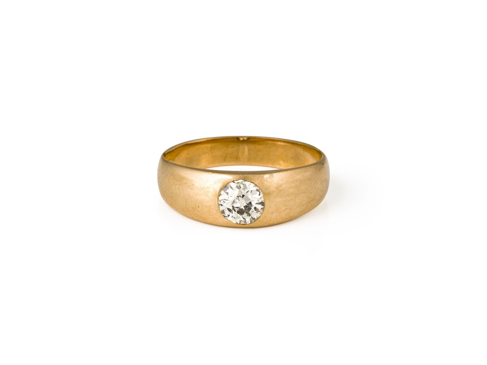 GG 585 (getestet). Ringmaß: ca. 59. Ringbreite: ca. 6,8 mm. Ges.-Gew.: ca. 4,7 g. Ring, besetzt mit einem Diamanten im Altschliff von mind. 0.55 ct. H/SI.