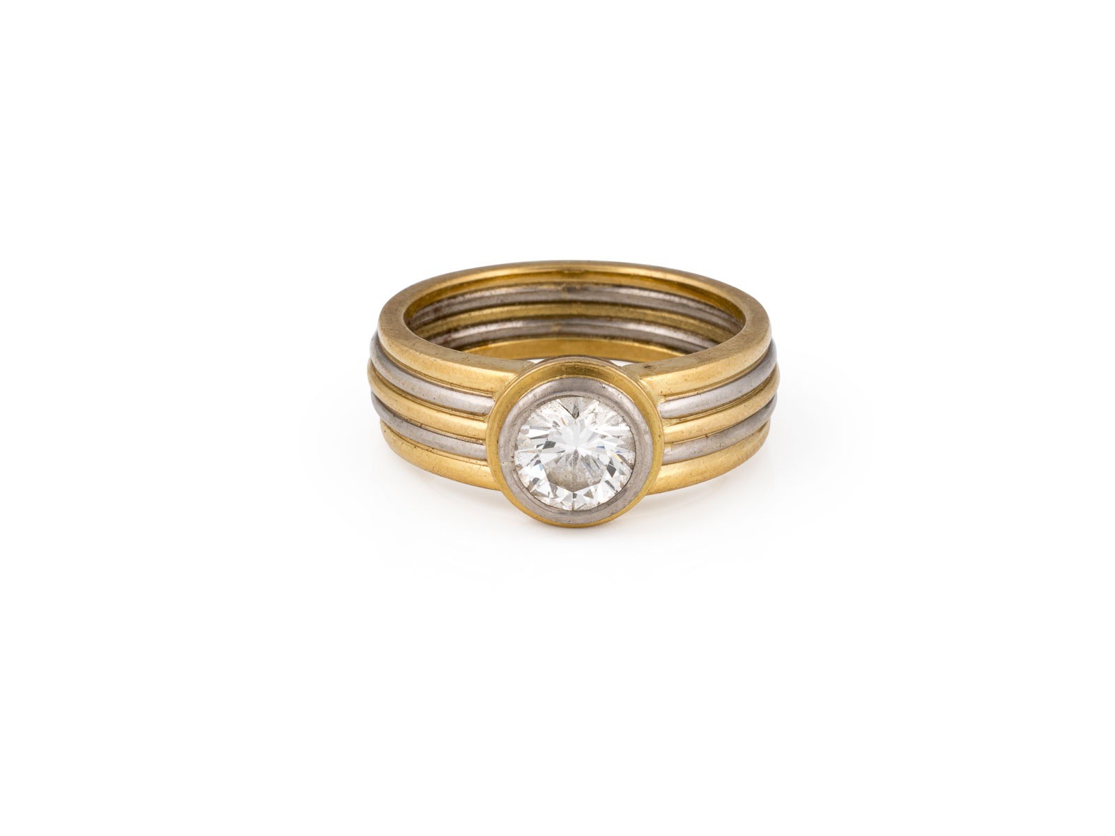WG/GG 750. Ringmaß: ca. 57. D.(Ringkopf): ca. 9,4 mm. Ges.-Gew.: ca. 9,4 g. Solitärring, besetzt mit einem Diamanten von ca. 1.10 ct. J/VS.