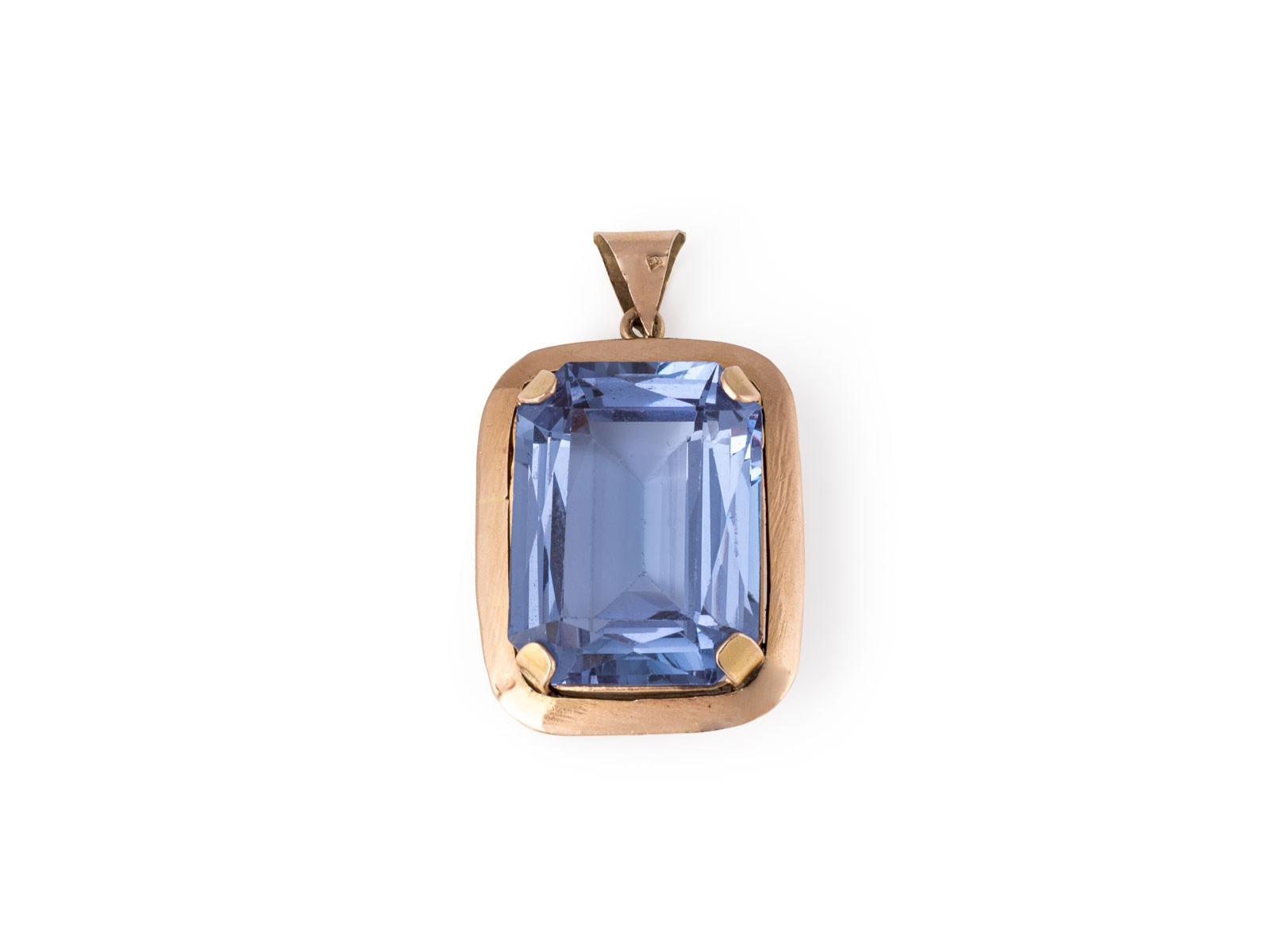 RG 585 (getestet). Maße: ca. 39,0 mm x 23,9 mm. Ges.-Gew.: ca. 14,7 g. Anhänger, besetzt mit einem großen, synthetischen Spinell von ca. 39.75 ct.