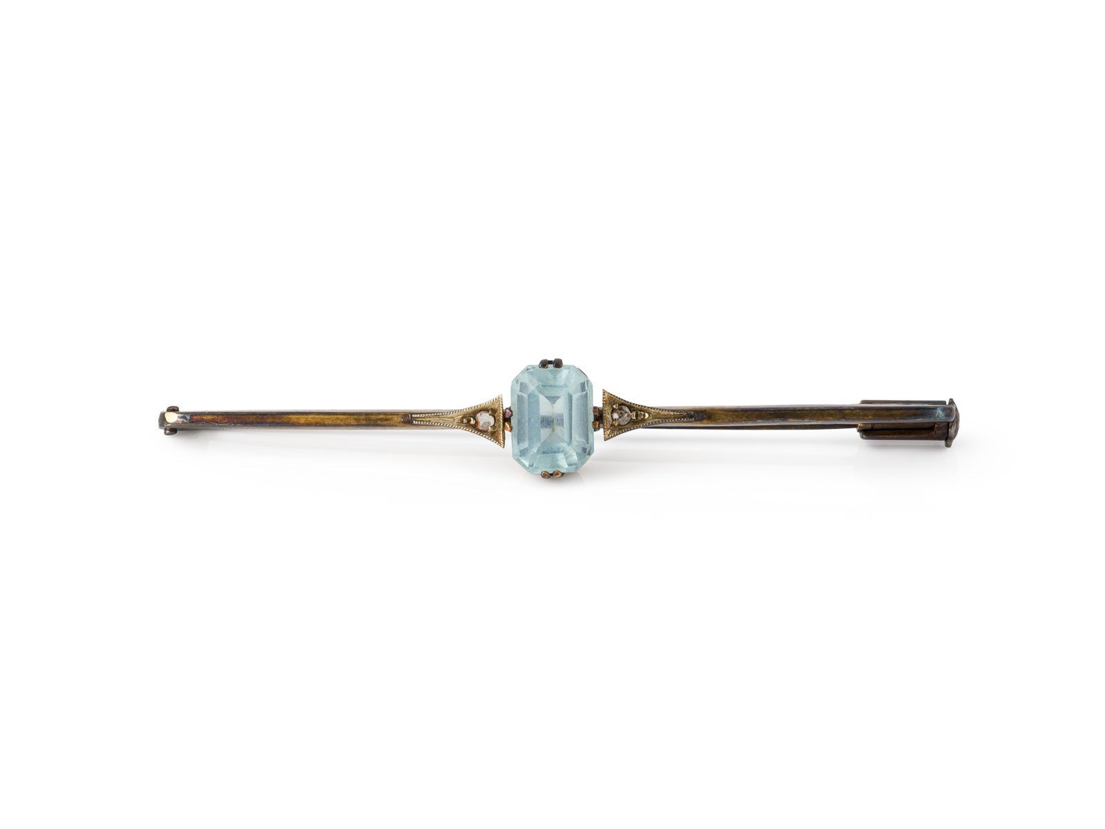 RG 585. Maße: ca. 54,5 mm x 8,2 mm. Ges.-Gew.: ca. 2,3 g. Stabbrosche, besetzt mit einem hellblauen Farbstein - wohl Spinell.