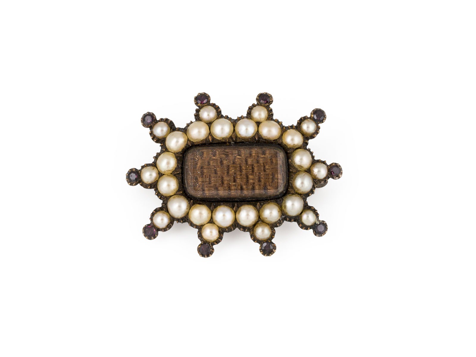 GG 333 (getestet). Maße: ca. 27,4 x 21,2 mm. Ges.-Gew.: ca. 5,1 g. Trauerschmuck-Brosche mit Echthaar-Einlage, besetzt mit Perlen und wohl kleinen Granaten