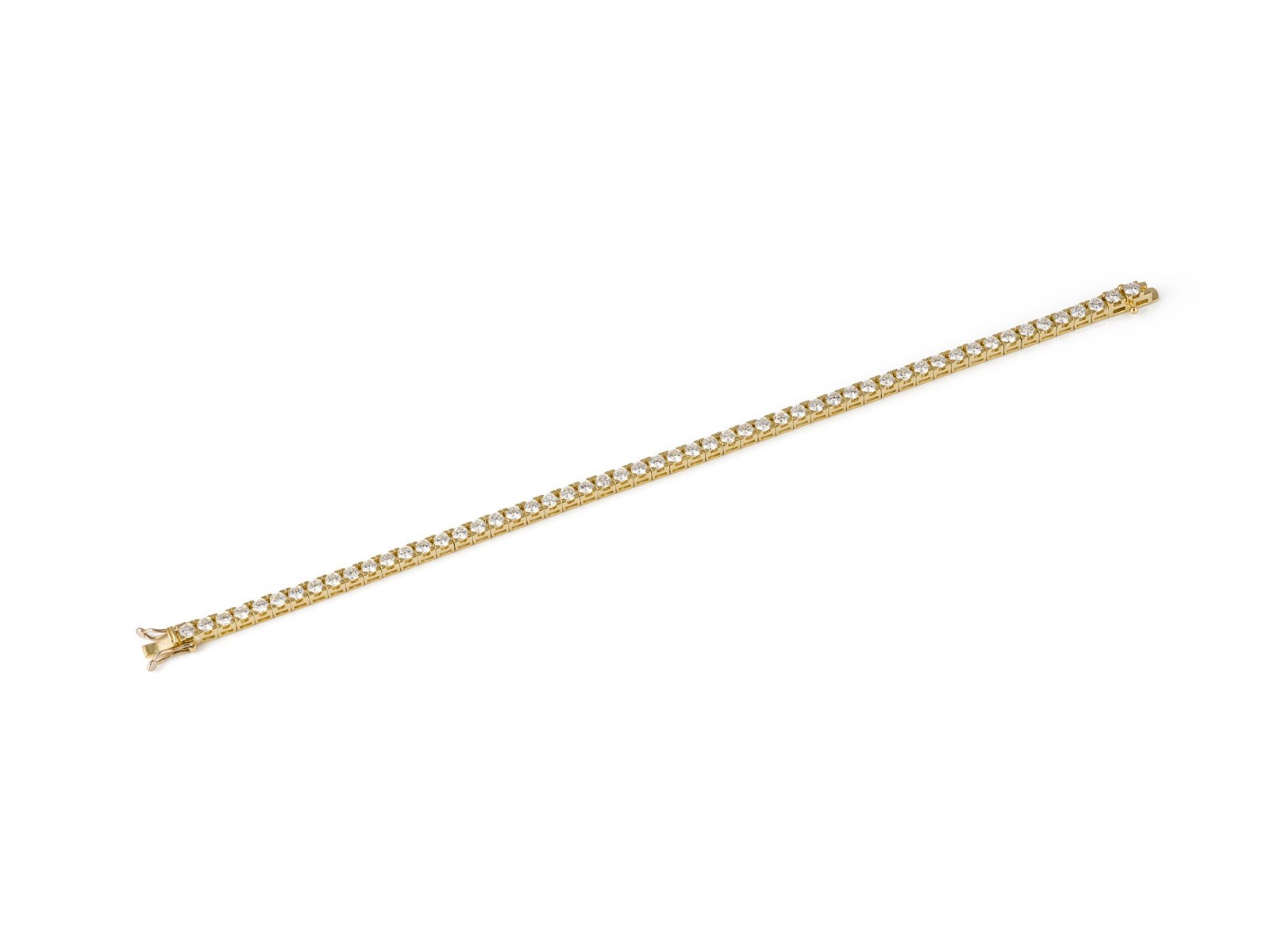 GG 750. Maße: L.: ca. 19,0 cm, B.: ca. 3,3 mm. Ges.-Gew.: ca. 12,3 g. Tennisarmband, besetzt mit Brillanten zus. ca. 5.04 ct. H-I/VVS-SI. Steckverschluss mit