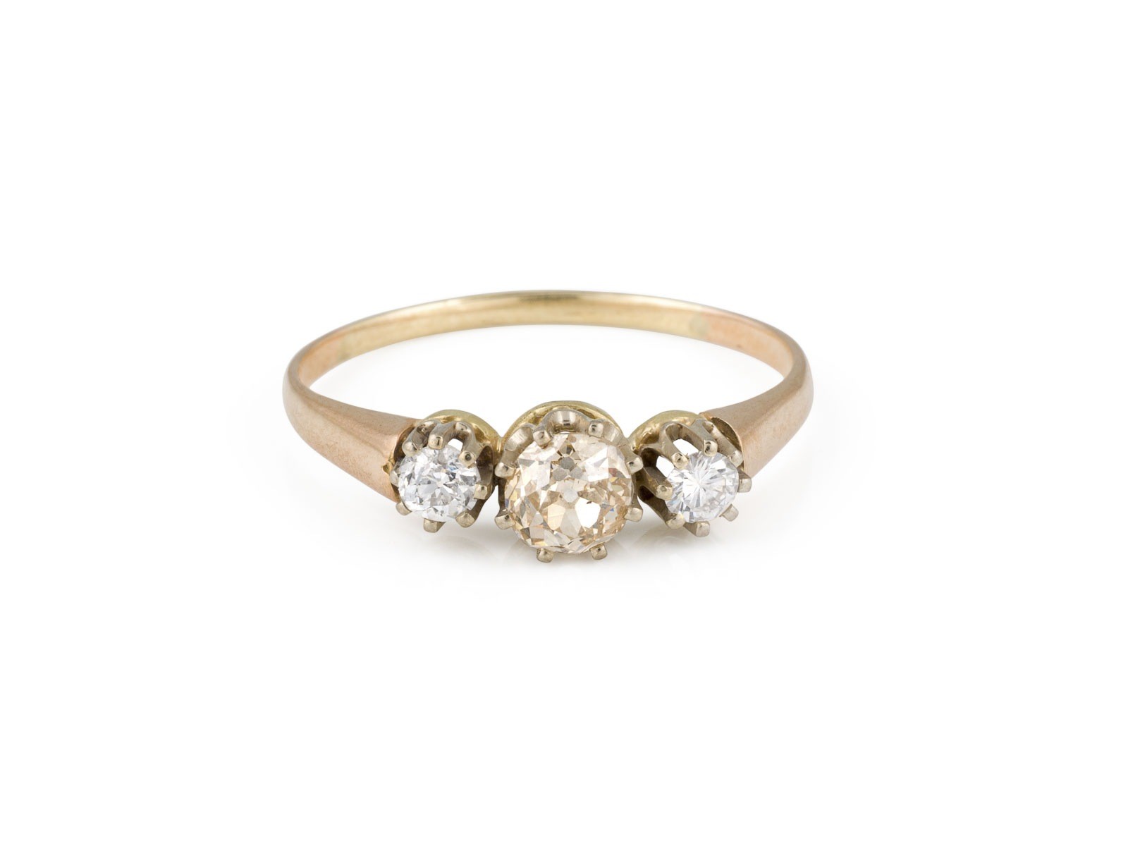 GG 585 (getestet). Ringmaß: ca. 60. Ringkopfmaße: ca. 14,3 x 5,8 mm. Ges.-Gew.: ca. 2,3 g. Trilogiering, besetzt mit einem zentralen Diamanten im Altschliff und seitlich zwei