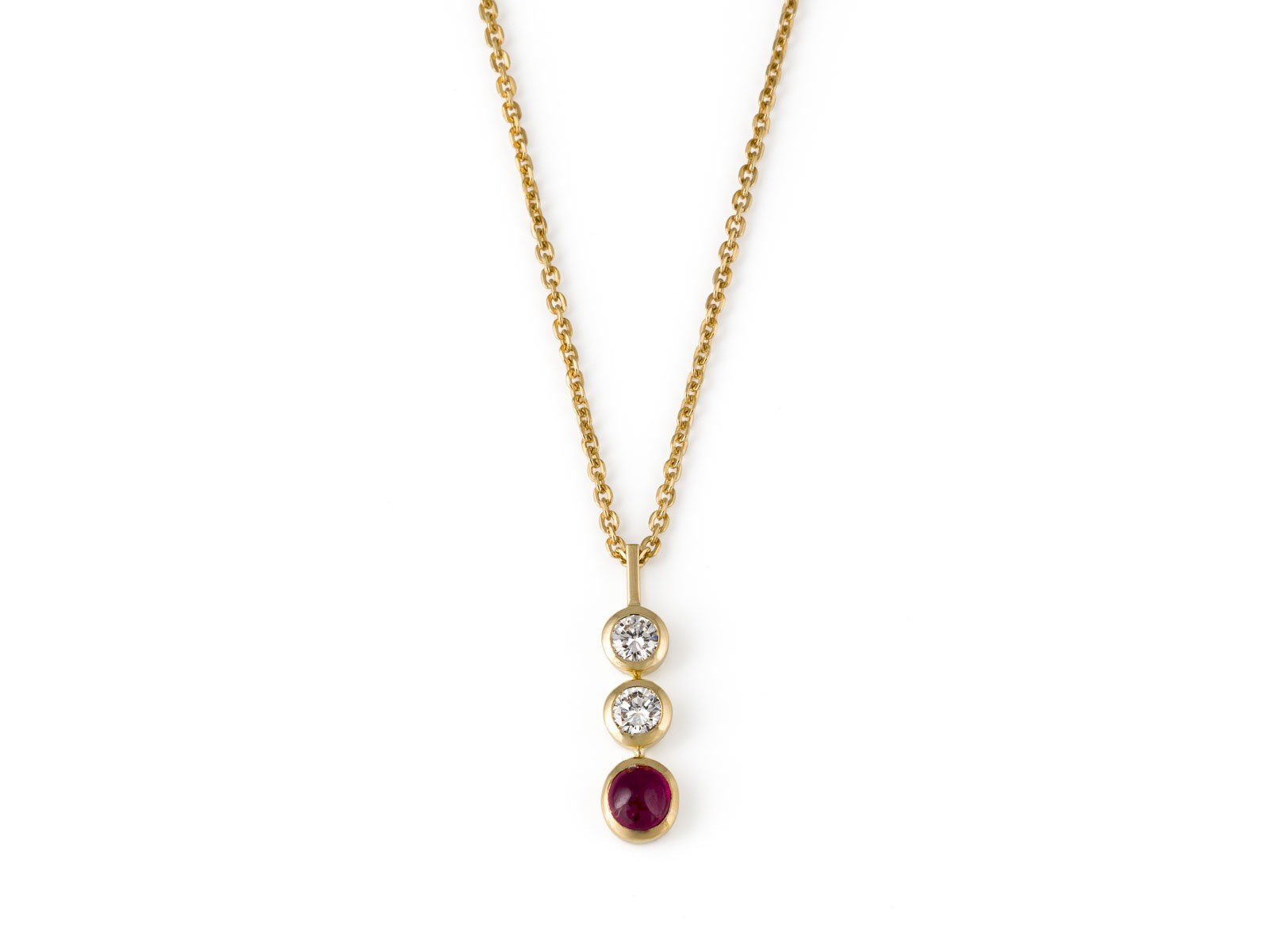 GG 750. Maße: L. ca. 42,0 cm. Anhänger: ca. 23,5 mm x 6,1. Ges.-Gew.: ca. 4,6 g. Trilogie-Anhänger, besetzt mit zwei Brillanten zus. ca. 0.35 ct. I-J/VVS-VS, sowie einem