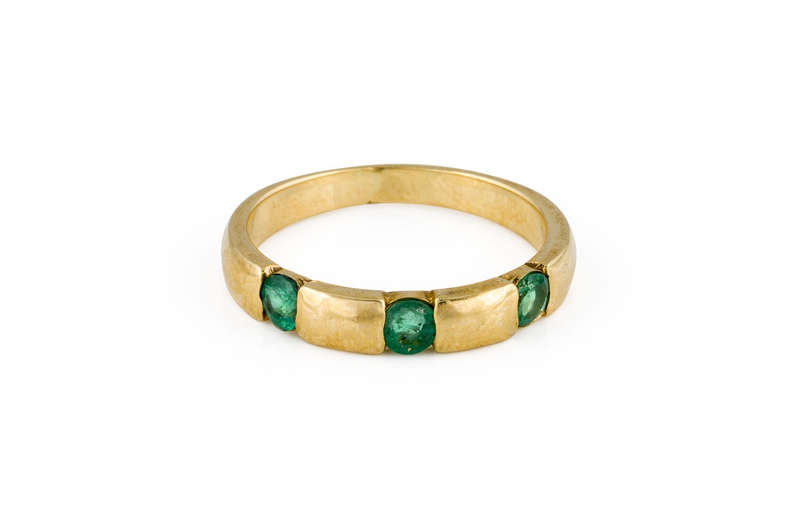 GG 750. Ringmaß: ca. 54. Ringmaß: ca. 3,6 mm. Ges.-Gew.: ca. 3,8 g. Ring, besetzt mit drei Smaragden zus. ca. 0.50 ct.