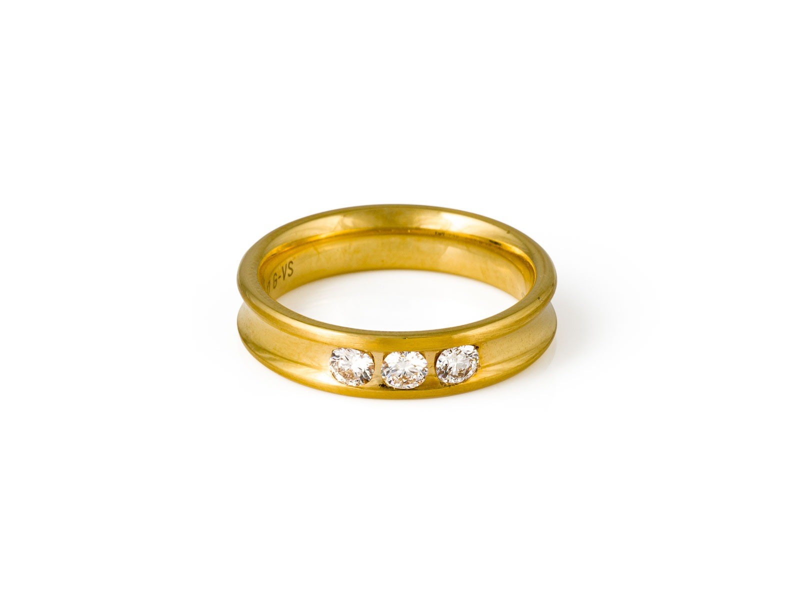 GG 750. Ringmaß: ca. 53. Ringbreite: ca. 4,5 mm. Ges.-Gew.: ca. 5,7 g. Trilogiering, besetzt mit 3 Brillanten á ca. 0.10 ct. G/VS.