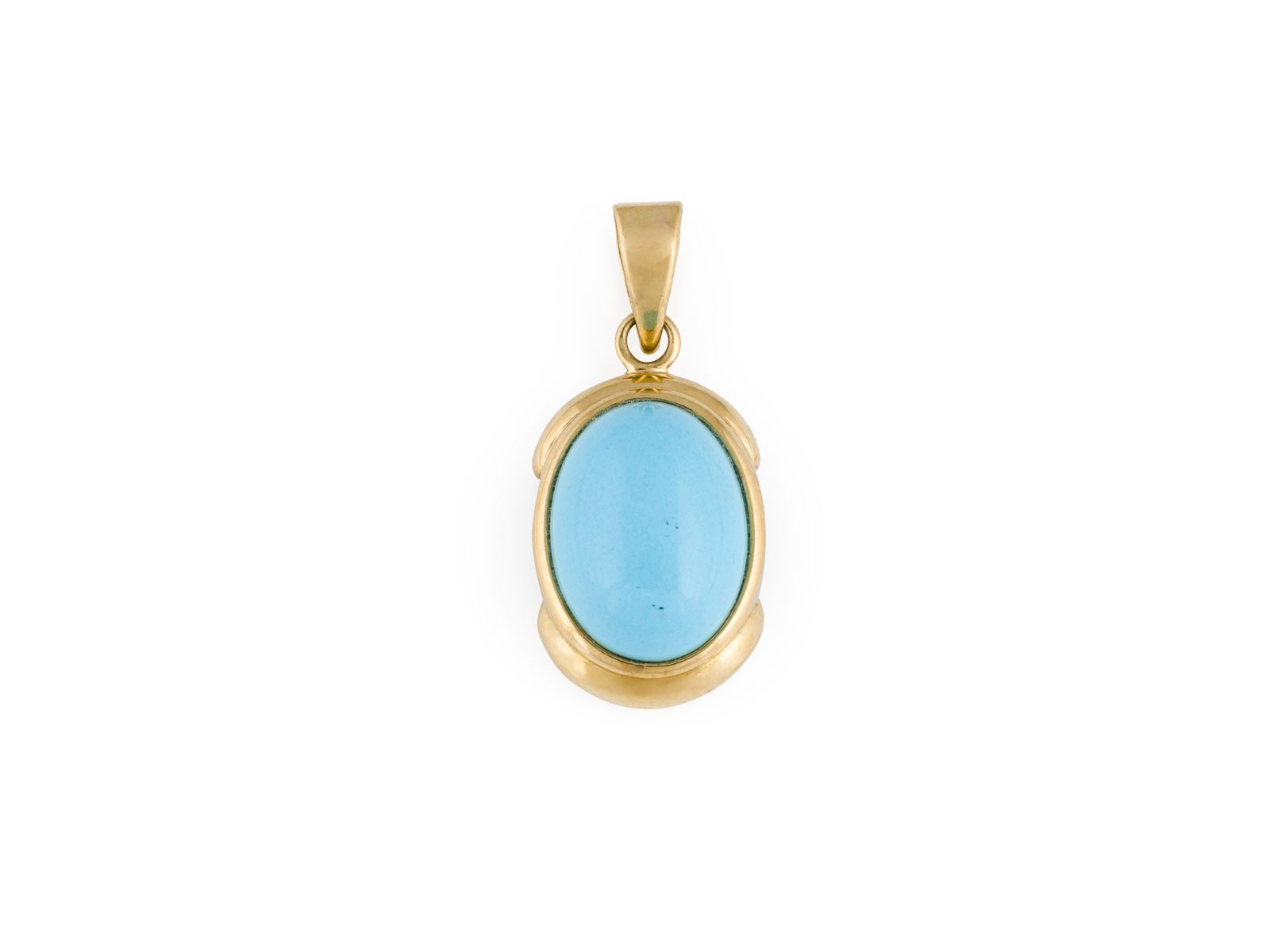 GG 750. Maße: ca. 32,0 x 14,0 mm. Ges.-Gew.: ca. 5,4 g. Anhänger, besetzt mit einem wohl Türkis-Cabochon von ca. 8.00 ct.
