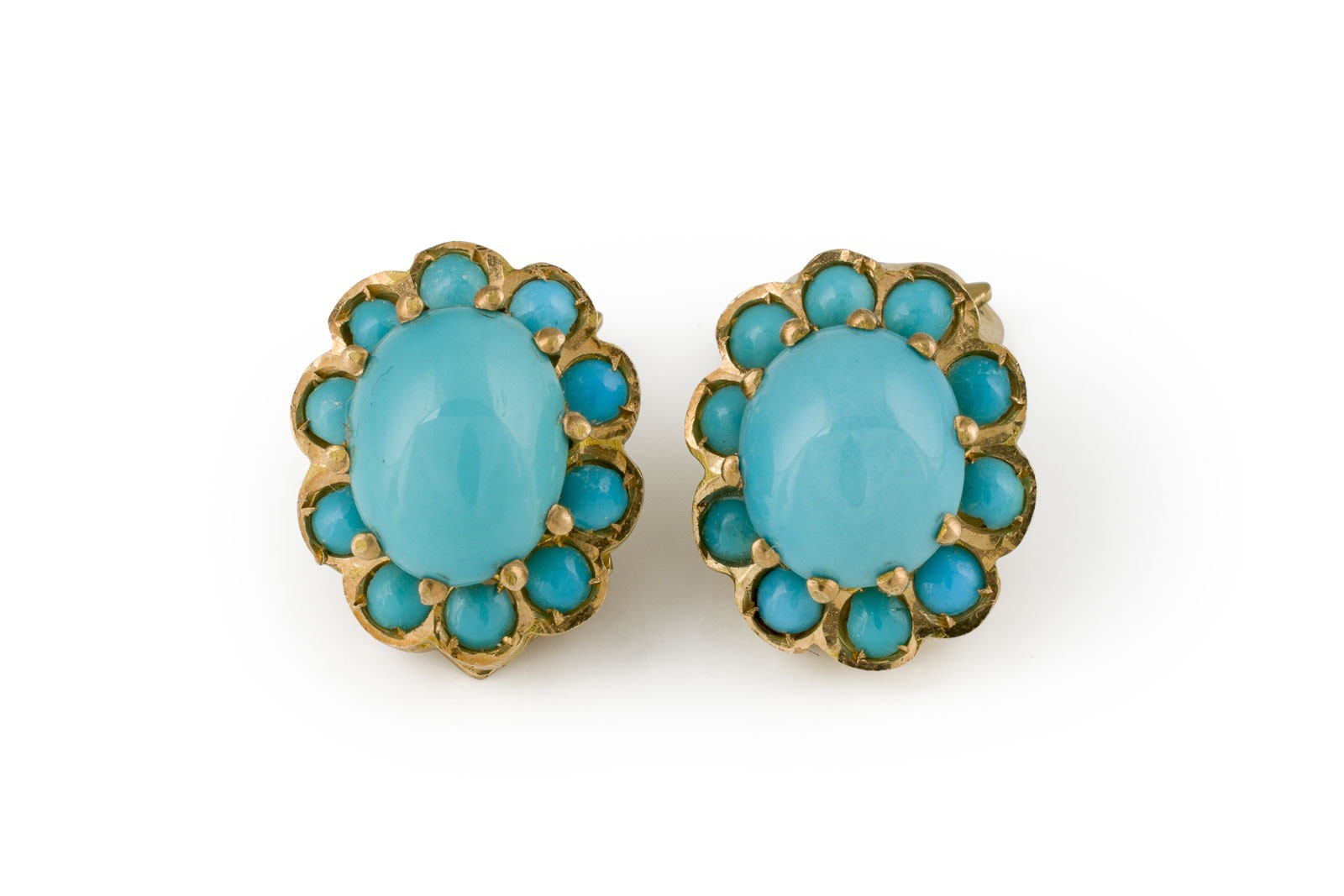 GG 585 (getestet). Maße: ca. 14,3 x 11,6 mm. Ges.-Gew.: ca. 5,2 g. Ohrclips, bestzt mit Türkisen von jeweils 3.20 ct. pro Clip. Möglicherweise Sleeping