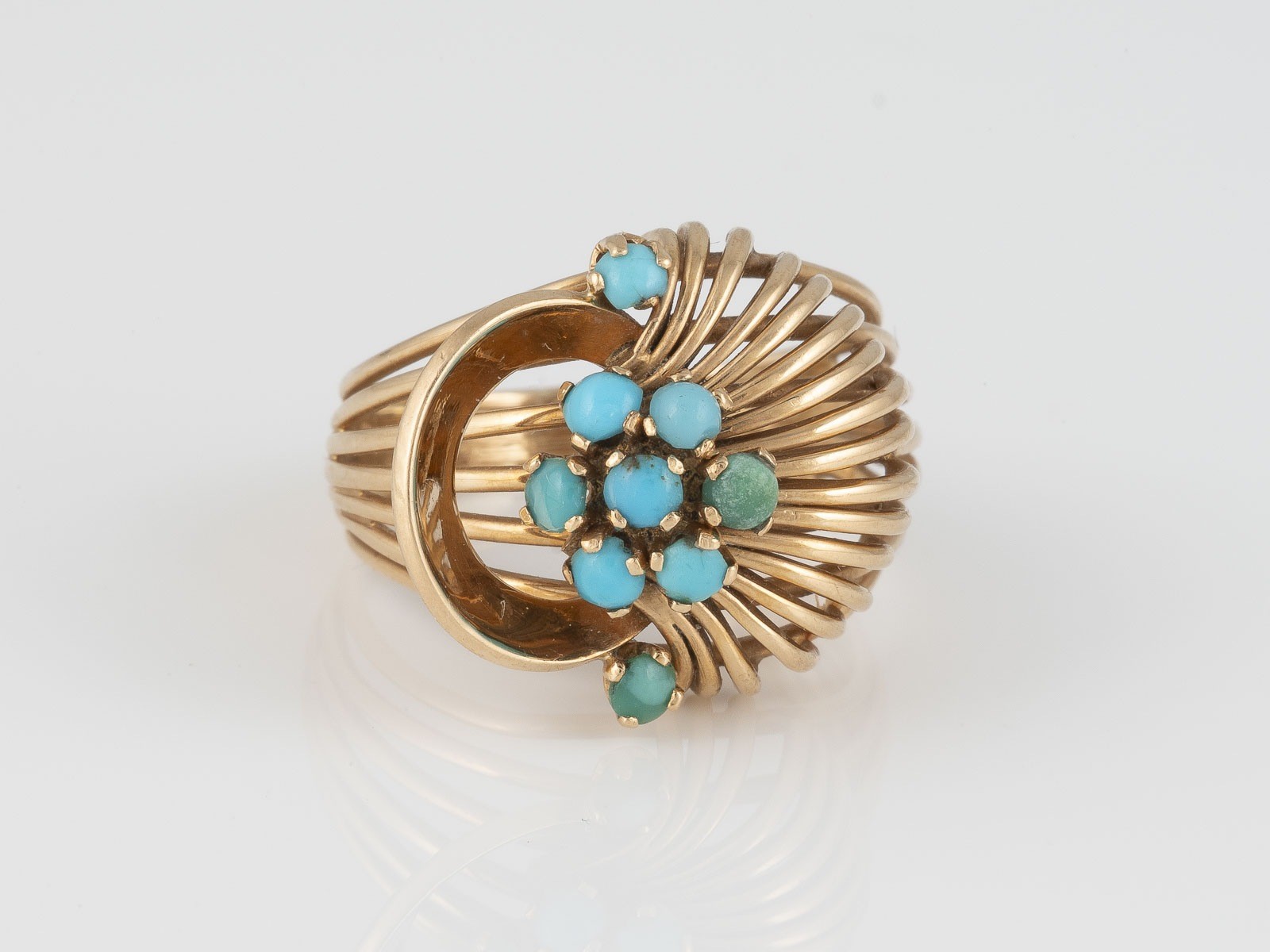Gelbgold. Ringmaß ca. 53, Ges.-Gew. ca. 6,7 g. Geprüft 18 K. Halbierte Türkisperlen, minimal besch. Zwei Perlen möglicherweise ausgetauscht.