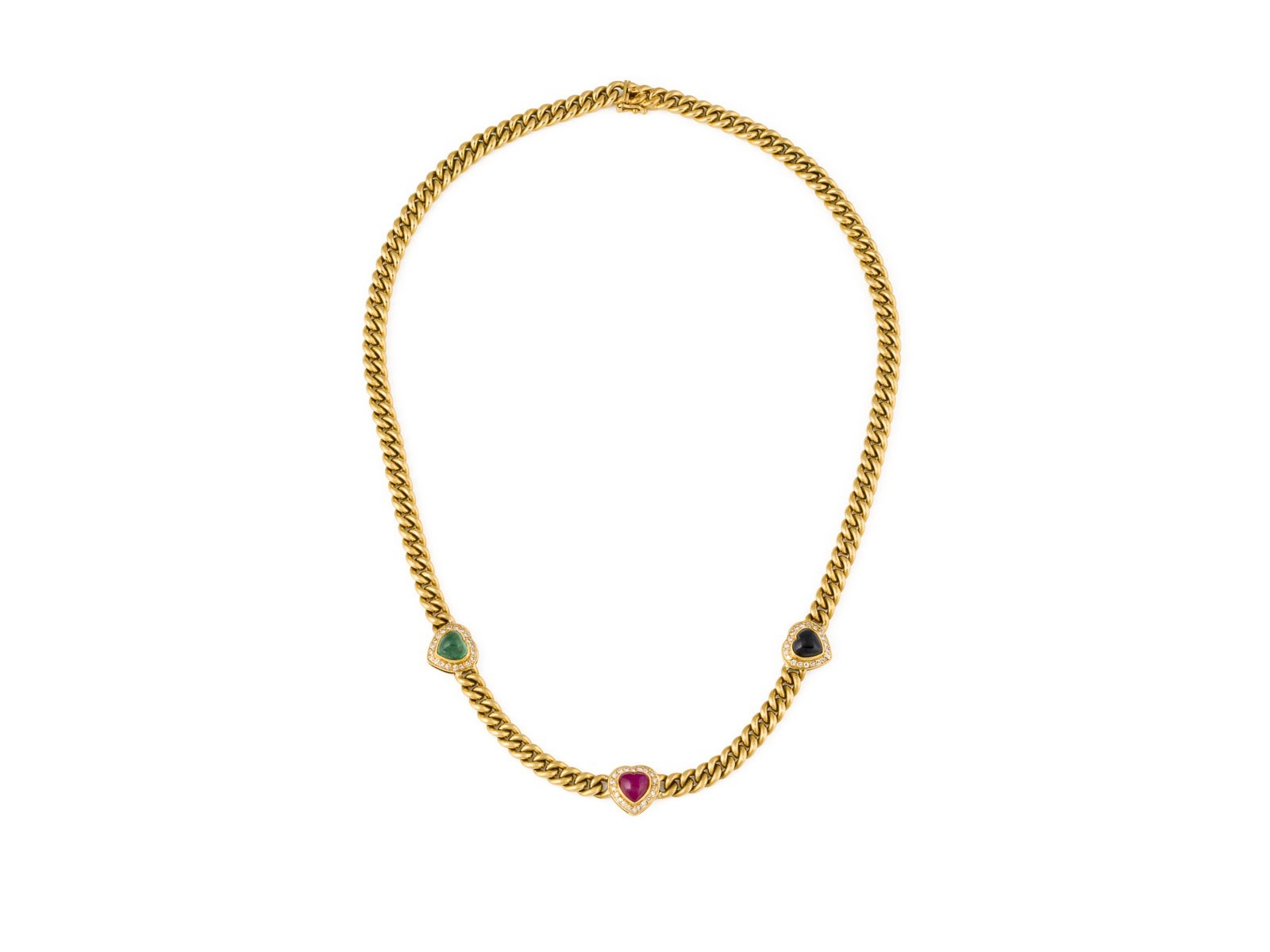 GG 750 (getestet). Maße: L.: ca. 42,0 cm. B.: ca. 10,7 mm. Ges.-Gew.: ca. 49,3 g. Tutti Frutti Panzer-Collier, besetzt mit jeweils einem Herz- Rubin-Cabochon von ca. 0.80