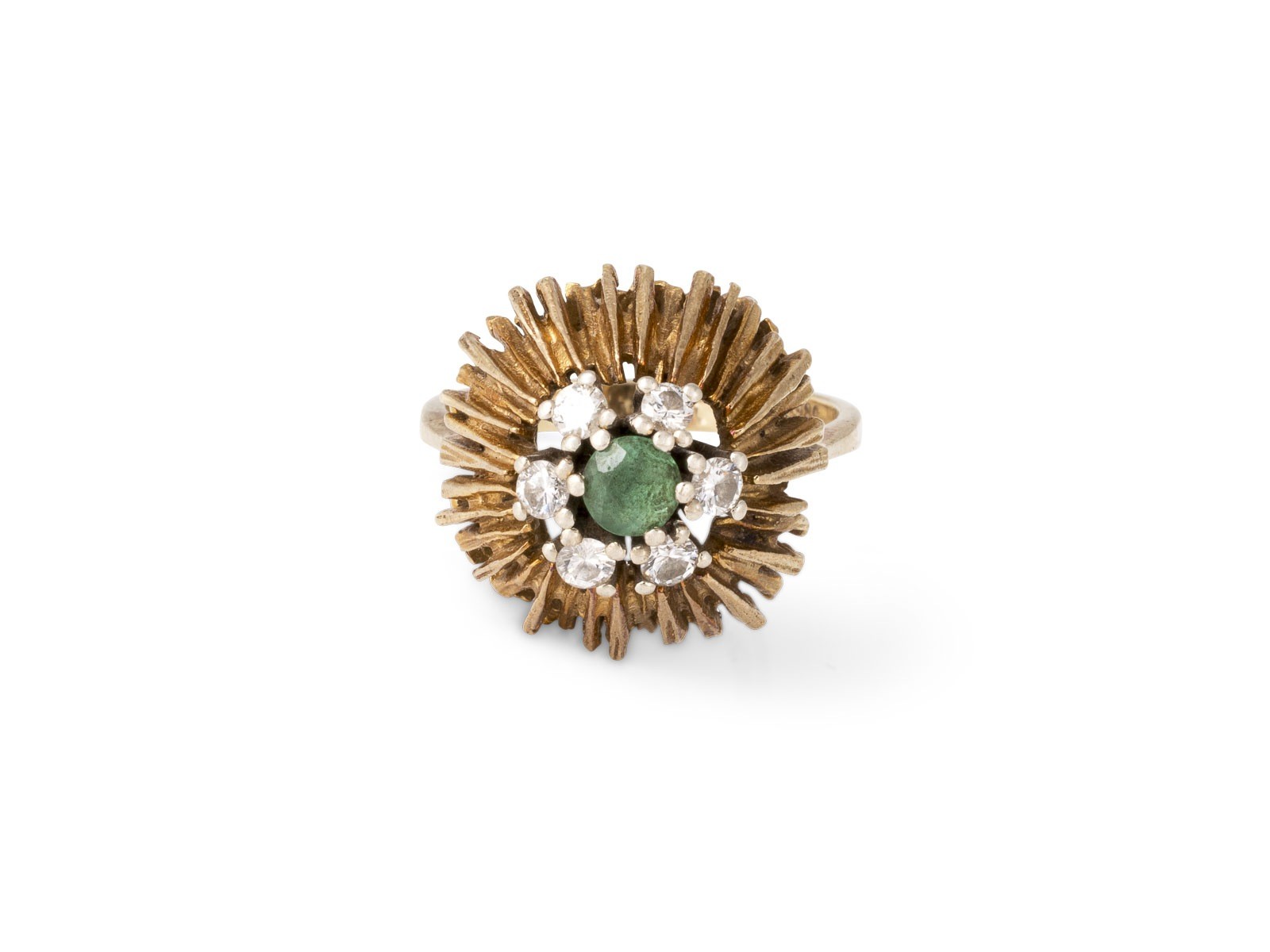 GG 585. Ringmaß: ca. 51. Ringkopfmaße: ca. 16,7 mm x 16,2. Ges.-Gew.: ca. 6,6 g. Hoher Vintage Cocktailring mit einem zentralen, grünen Stein - wohl Turmalin und einem