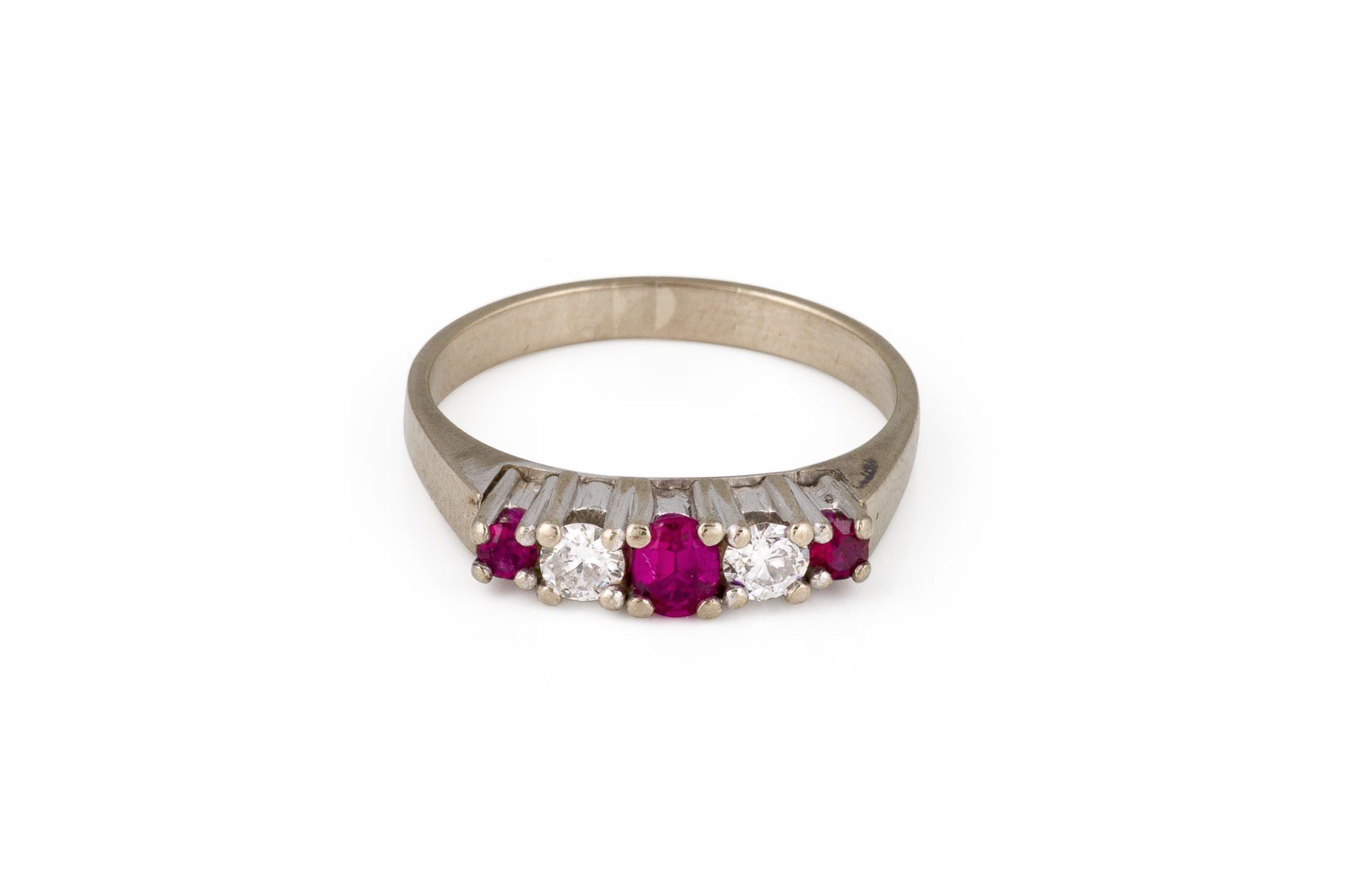 WG 585. Ringmaß: ca. 54. Ringbreite: ca. 3,9 mm. Ges.-Gew.: ca. 3,8 g. Ring, besetzt mit zwei Brillanten zus. ca. 0.22 ct. G-H/VS, sowie pinken Farbsteinen -