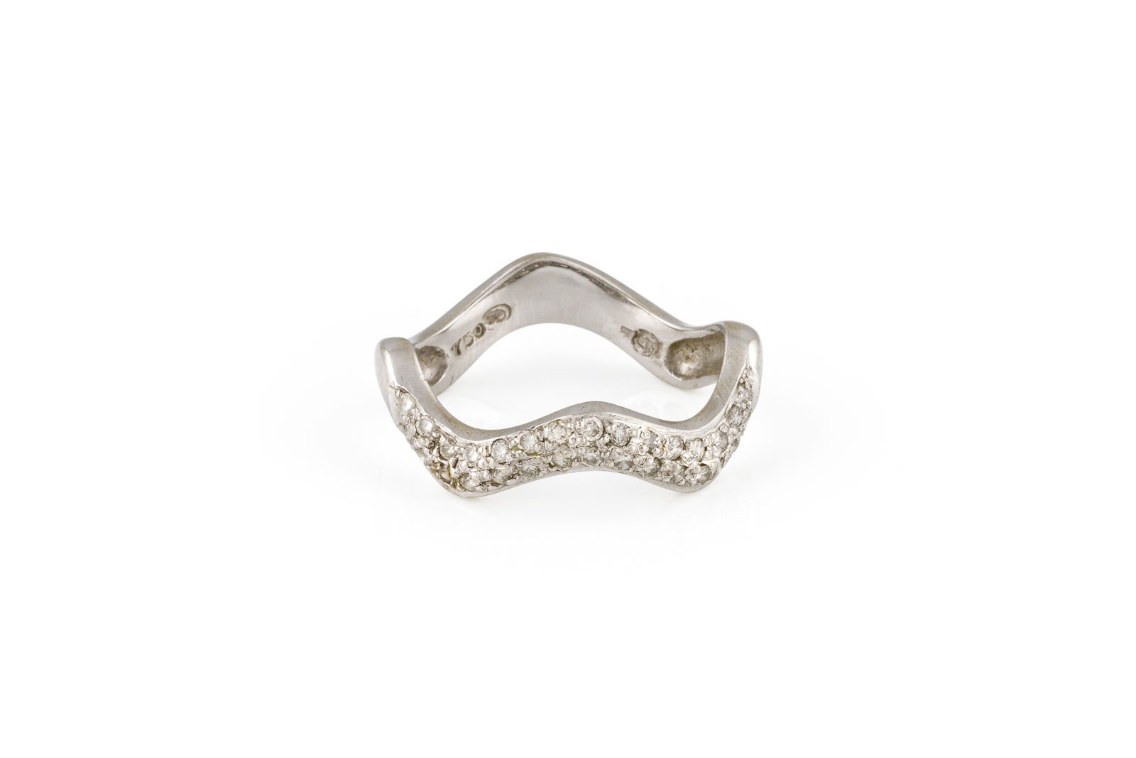 WG 750. Ringmaß: ca. 51. Ringbreite: ca. 3,3 mm. Ges.-Gew.: ca. 3,1 g. Wellenförmiger Halbmemoire-Ring, besetzt mit Brillanten zus. ca. 0.15 ct.