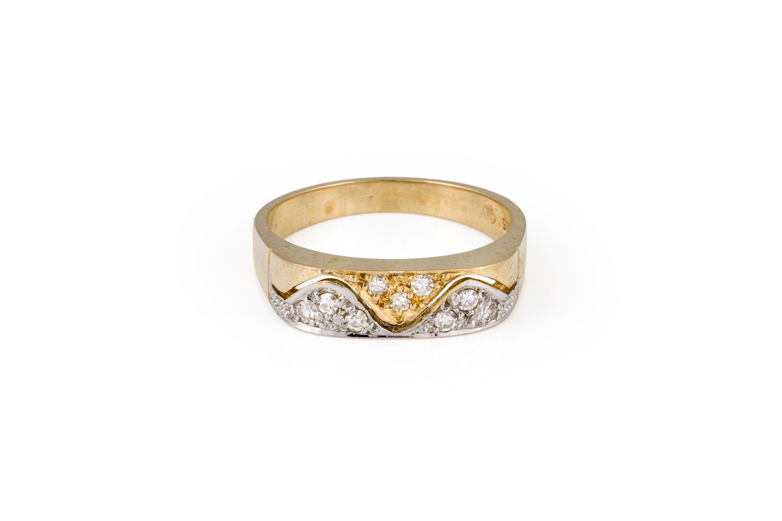 WG/GG 585. Ringmaß: ca. 55. Ringbreite: ca. 5,1 mm. Ges.-Gew.: ca. 3,3 g. Ring, besetzt mit Diamanten im 8/8-Schliff zus. ca. 0.13 ct.