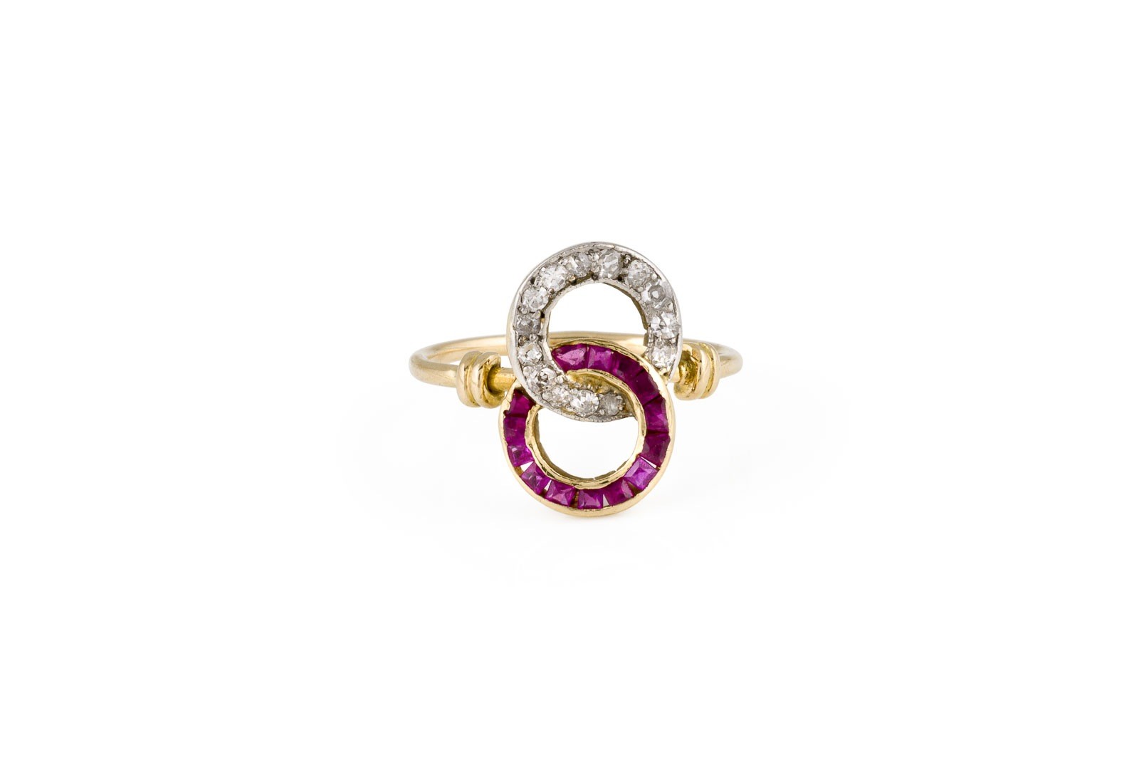 GG 585. Ringmaß: ca. 45,5. Ringkopfmaße: ca. 13,7 x 9,0 mm. Ges.-Gew.: ca. 1,8 g. Ring, besetzt mit Diamanten im Altschliff zus. ca. 0.20 ct., sowie Rubine zus. ca. 0.25