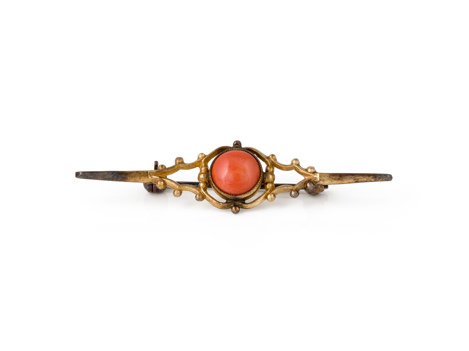 GG 585 (getestet). Maße: ca. 47,2 mm x 11,6 mm. Ges.-Gew.: ca. 2,8 g. Brosche mit einer zentralen Koralle von ca. 1.00-1.50 ct.