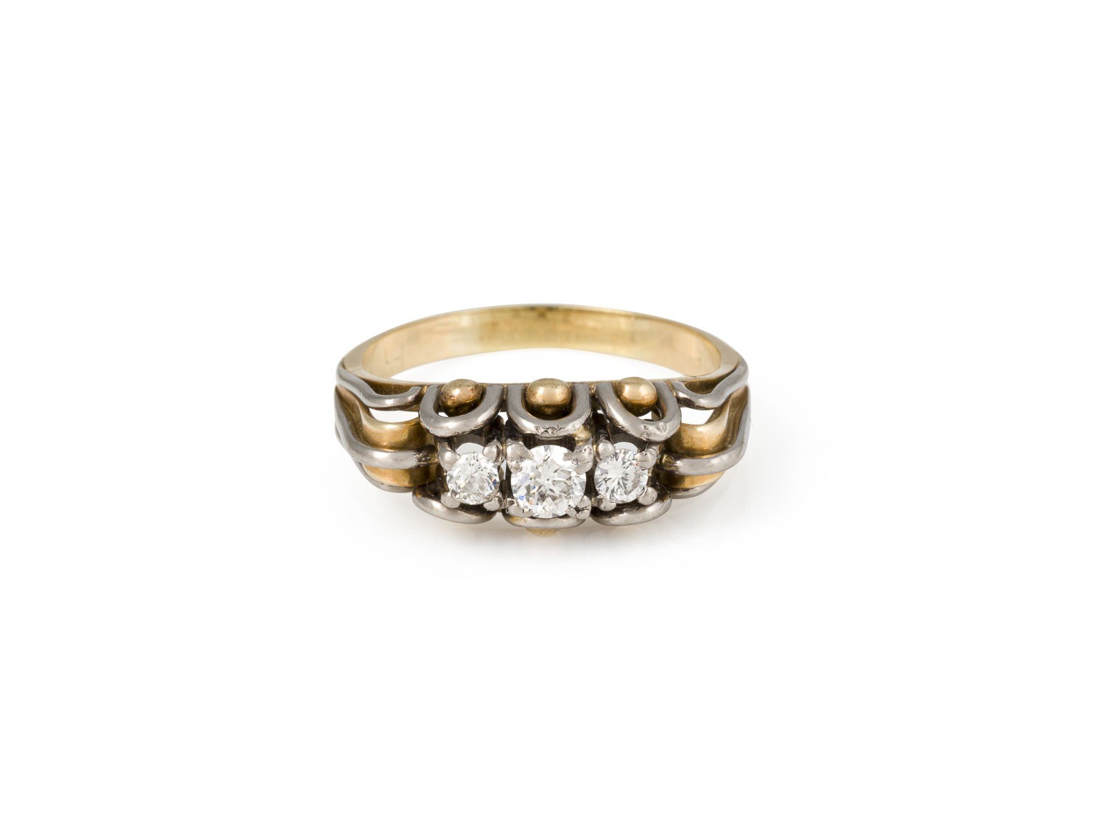 WG/GG 585 (getestet). Ringmaß: ca. 55. Ringbreite: ca. 7,9 mm. Ges.-Gew.: ca. 4,7 g. Ziervoller Bicolor Ring mit 3 Brillanten zus. ca. 0.28 ct. H/VS.