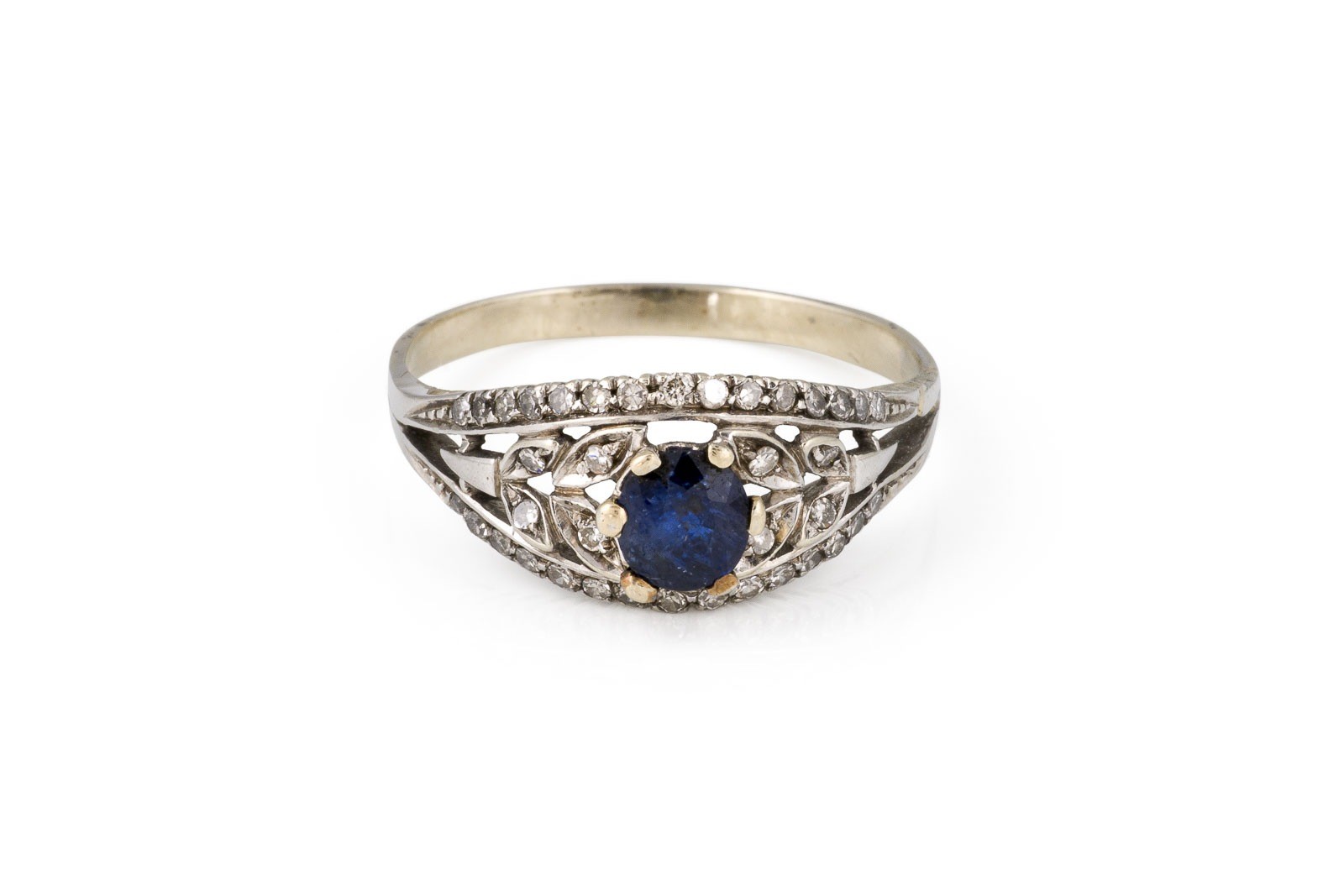 WG 585 (getestet). Ringmaß: ca. 66. Ringbreite: ca. 10,0 mm. Ges.-Gew.: ca. 4,7 g. Ziervoller Ring, besetzt mit einem zentralen Saphir von ca. 0.70 ct., sowie weiterer