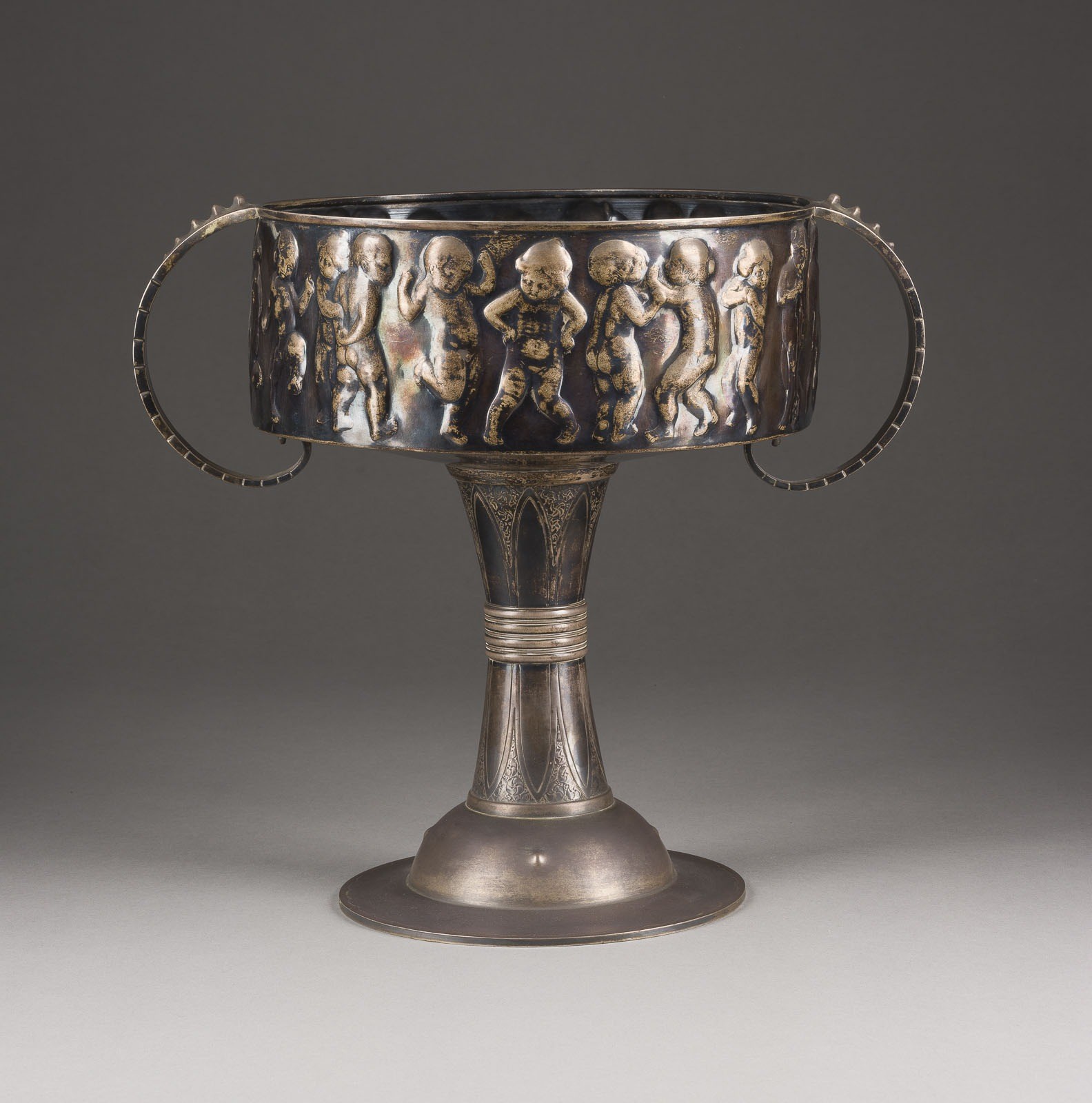 Silber, gefüllt. Gew. 2011 g, H. 31,4 cm. Oben am Rand bez. 'Ad. Schmid entw. u. getrieben 1910' sowie 'F. 900/000'. Teilw. gebogen.
