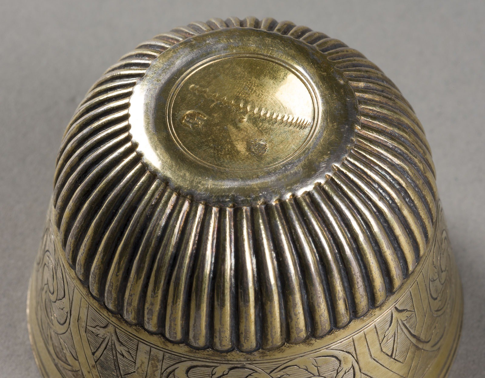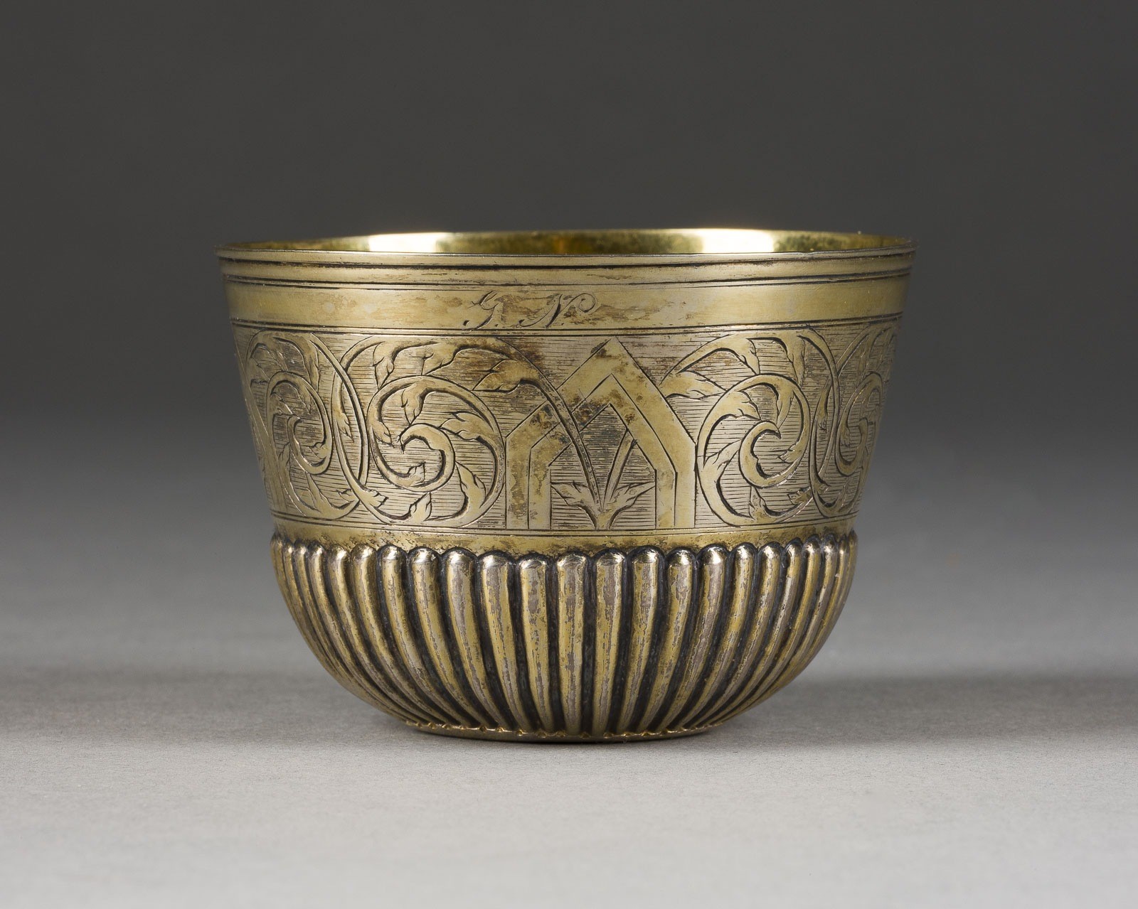 Silber, vergoldet. Gew. 65 g, H. 4,7 cm. Auf der Bodenunterseite punziert mit Stadtmarke und Meisterzeichen 'FJH' sowie Tremolierstrich. Monogrammgravur 'G.N.'.