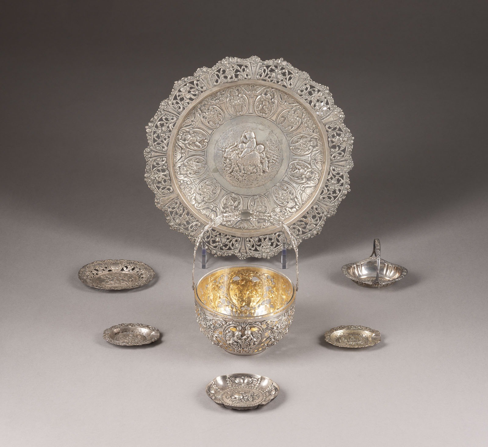 Silber, gedrückt, teils innen vergoldet. L. 6,8-27,5 cm, 856 g. Teils punziert mit Halbmond, Krone, Herstellersignet und Feingehalt '800'. Mit Blumendekor und Putti. Min. Oberflächenkratzer.